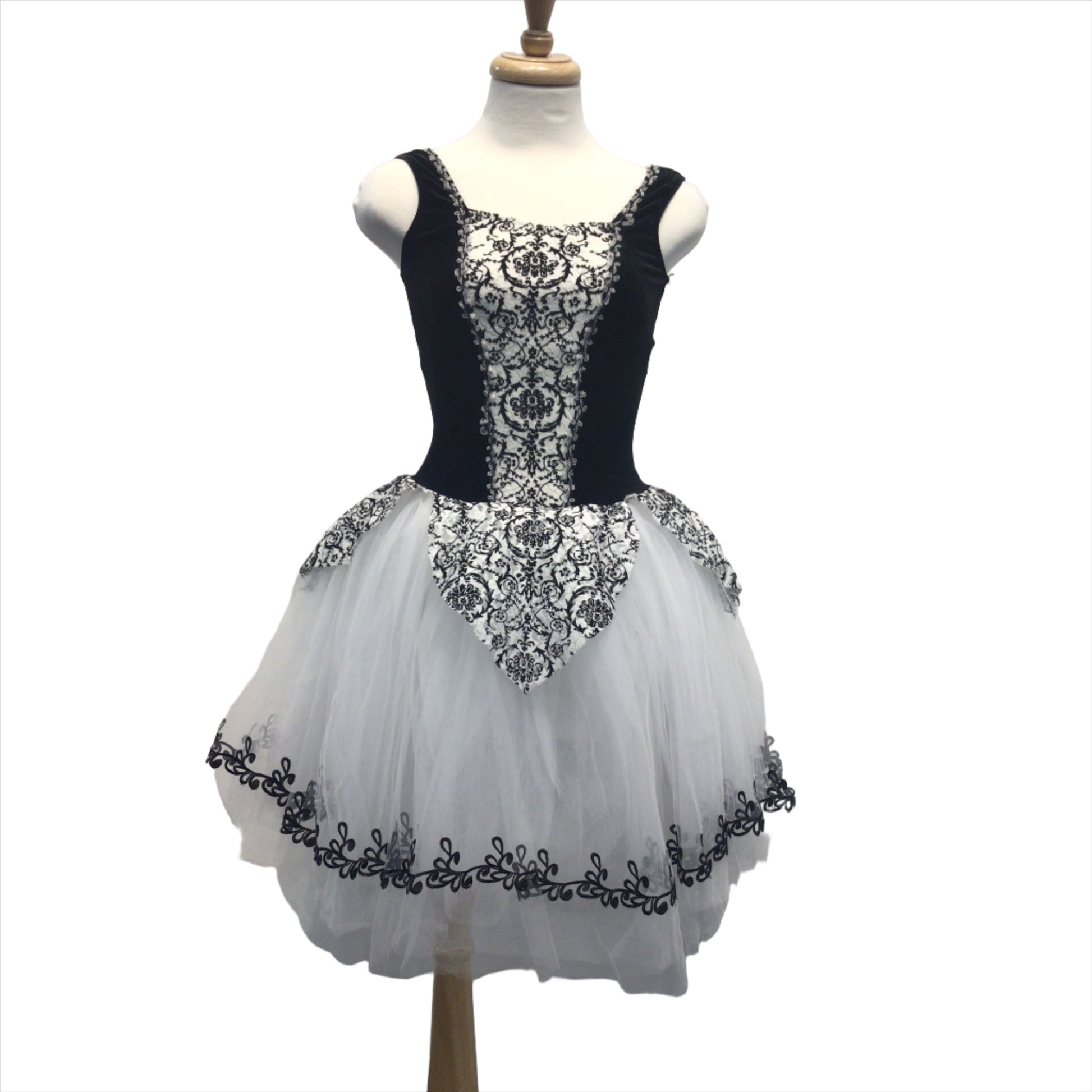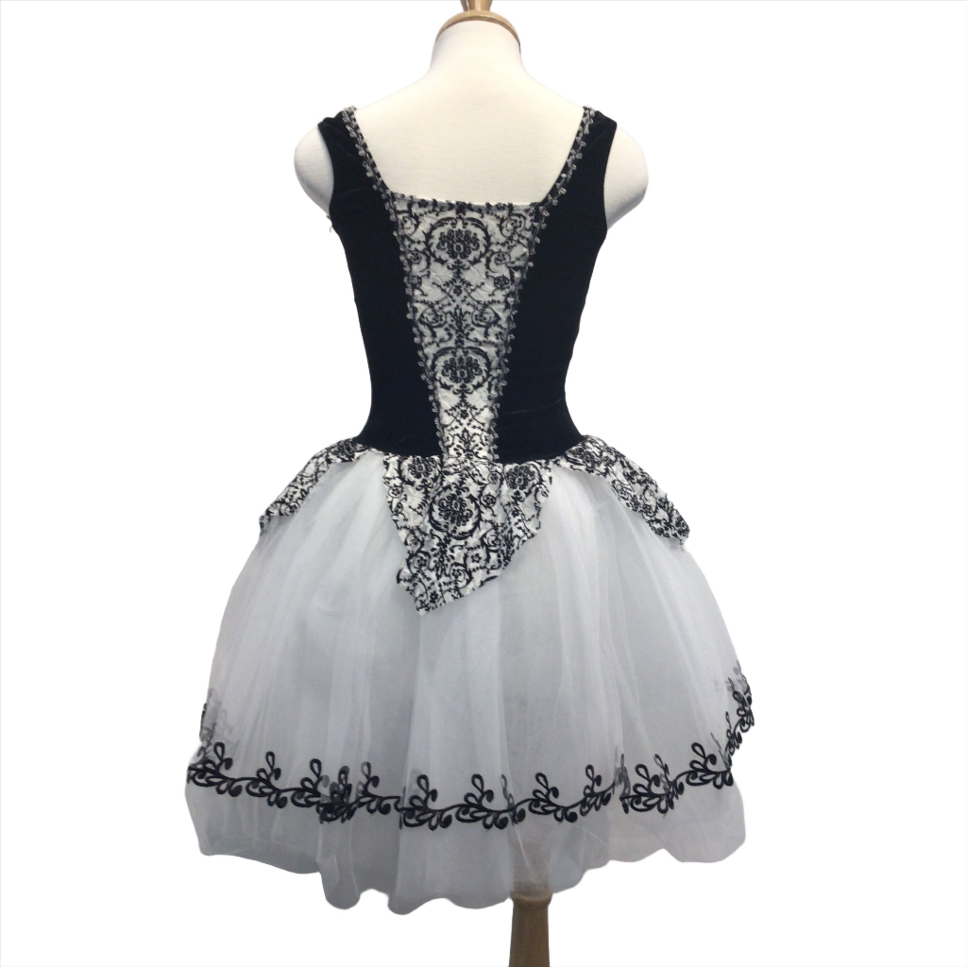Raymonda or Paquita this tutu is perfect for any ballet variation. The black velvet bodysuit has a U front and back with a baroque patterned mid panel on the front and back of the bodice that continues into a scalloped over skirt. The five layer of tulle on the attached skirt makes the tutu full with a top layer that has a black swirly trim to make this costume timeless. Includes a diamond hair comb Comes in a small adult and is in perfect condition.