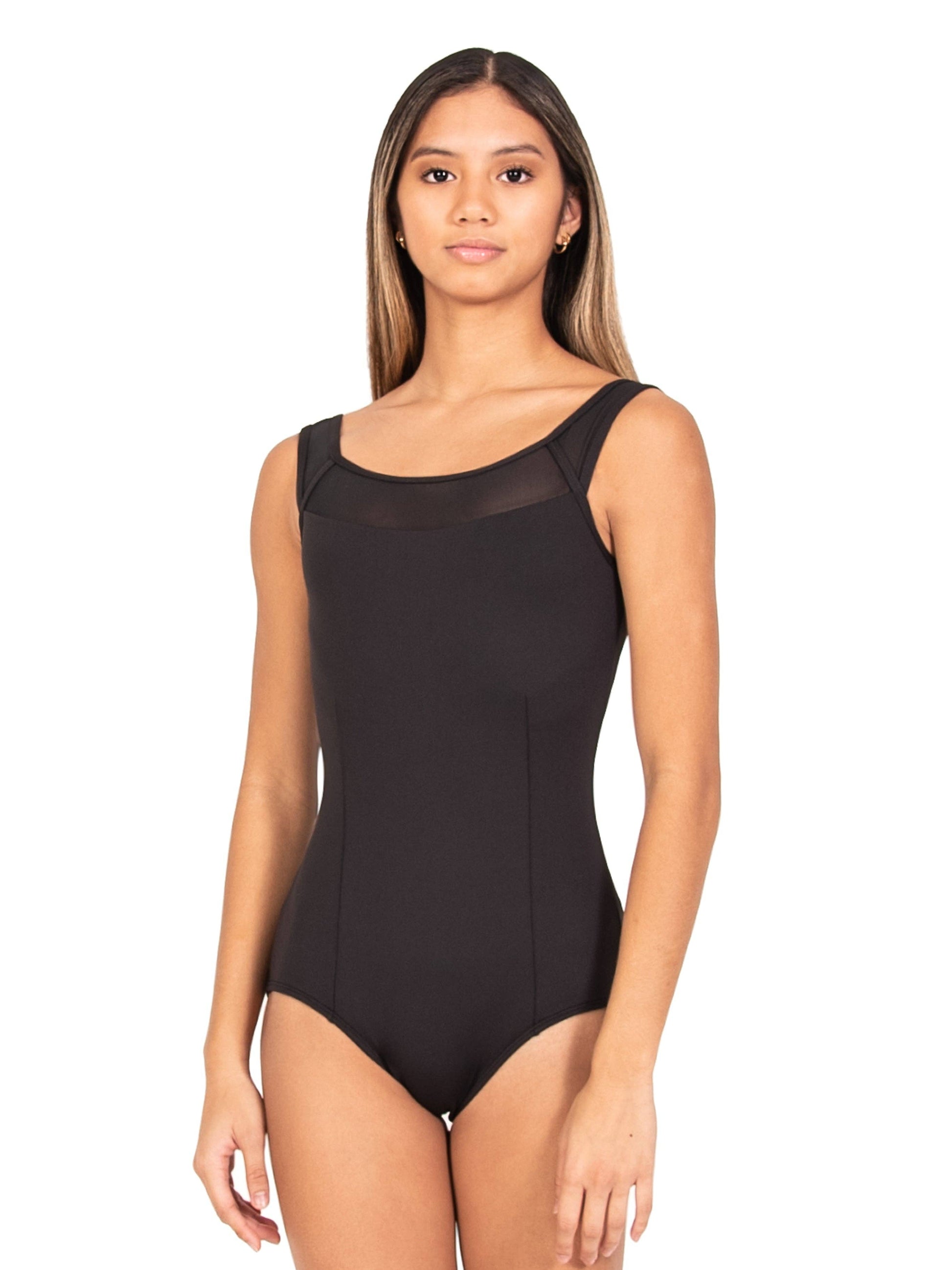 Features -expressive mesh neckline and shoulder straps -classically designed princess seams -memorySTRETCH™ moisture wicking front-lining -full coverage classic ballet-cut leg lines -constructed using our fan favorite fabrics: ProWEAR™, PowerMesh, and memorySTRETCH™