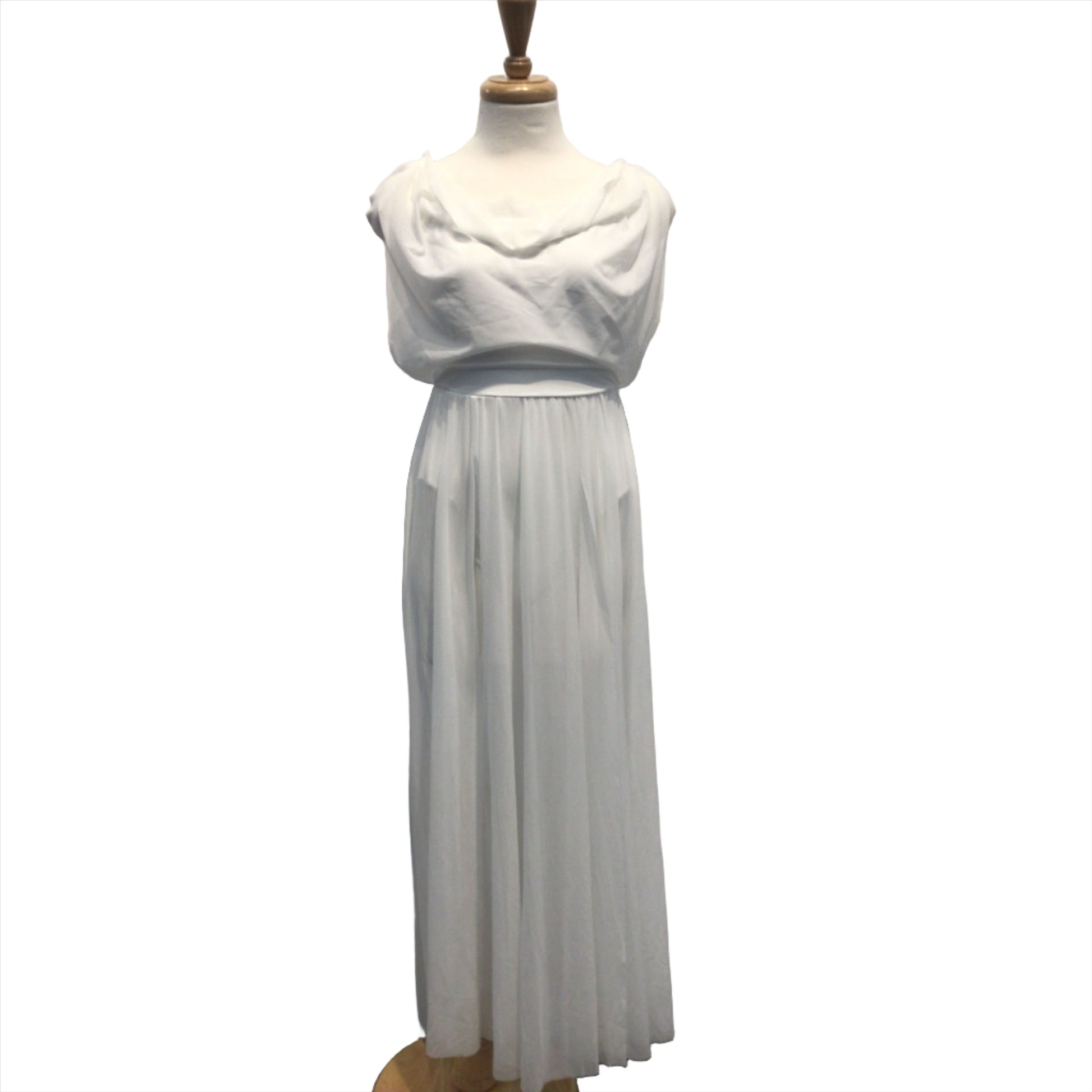 This elegant Grecian style lyrical dress is an adult small, full length white dress with built in bodysuit. This beauty is so versatile it can be used for ballet, lyrical or even contemporary. For freedom of extension and movement, this mesh skirt has dual leg slits, with a flattering cowl neck line front and back. In excellent condition.