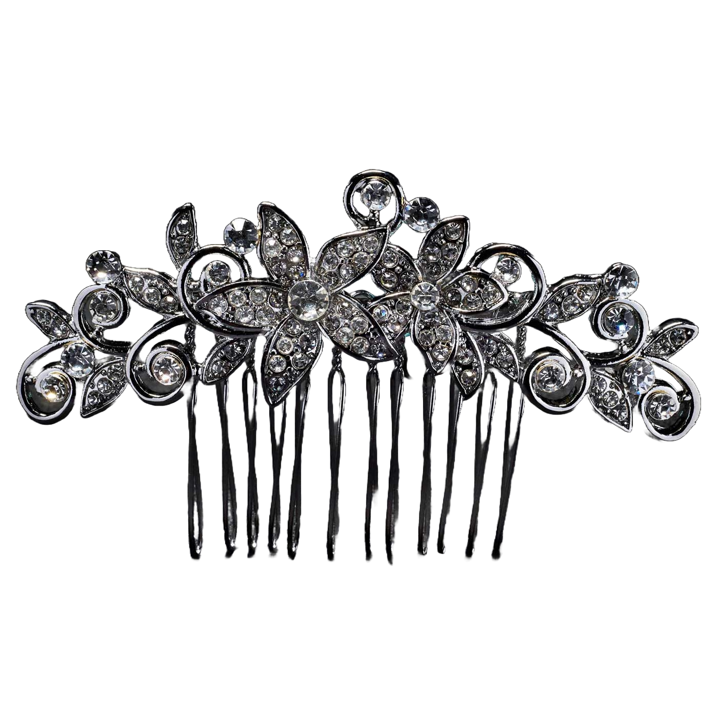 This Kissed By Glitter crystal rhinestone and silver hair comb has a beautiful open weave floral pattern and sparkles with scattered rhinestones - suitable for any occasion or performance. The sturdy metal comb ensures this lovely piece is securely held at the side or back of your hair, under or over the top of a bun for dance or formal wear.