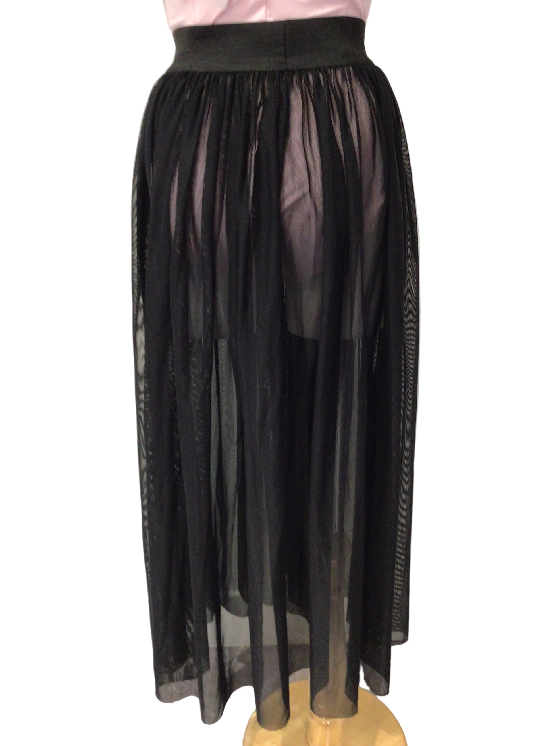 This long black power mesh skirt has one slit, an elastic waistband and comes in a medium adult size.