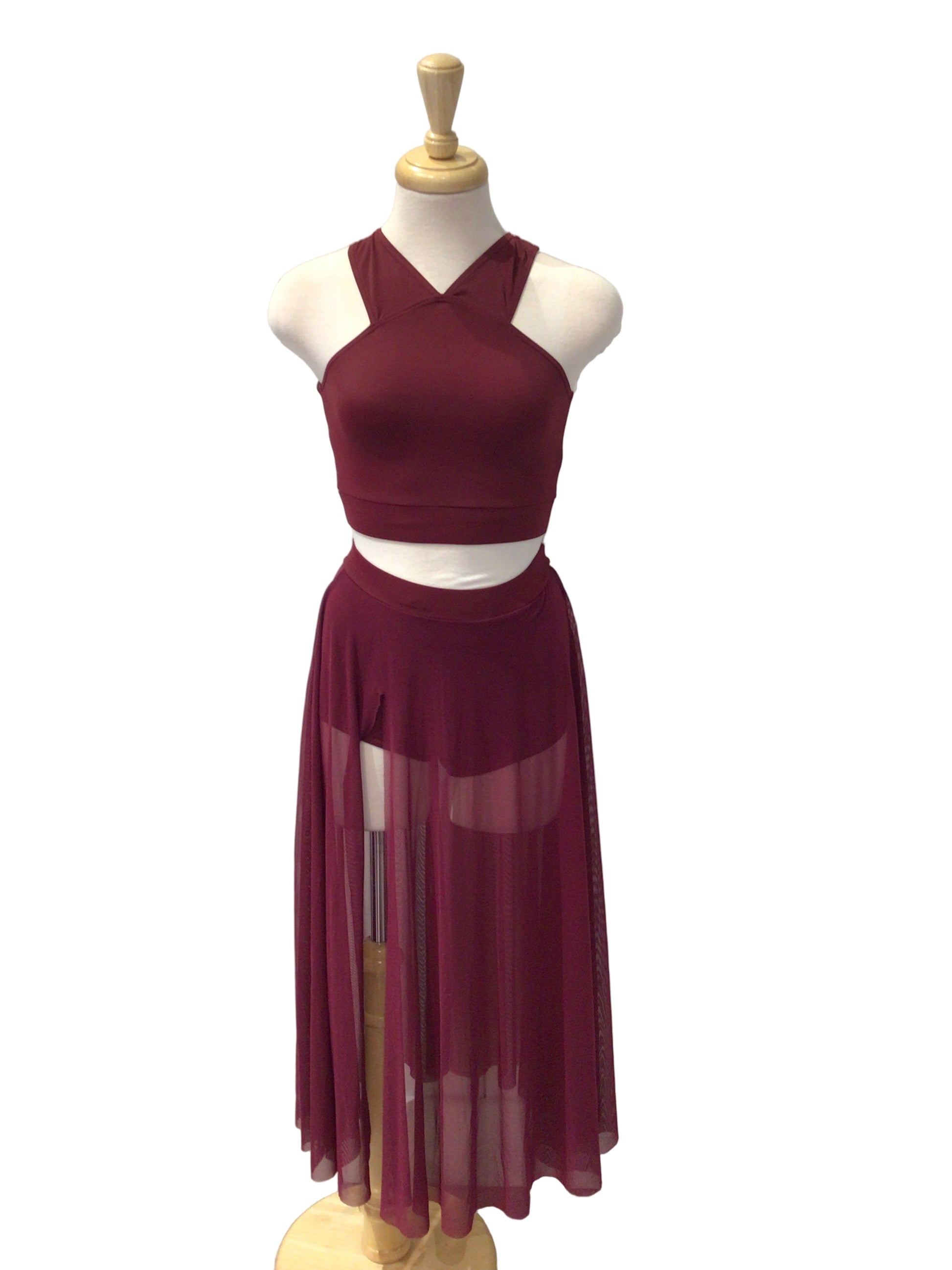 This versatile outfit can be used on stage or in the studio. The maroon sports top has a unique triangle cutout with straps on the bottom and a high neck and back. The matching full length mesh skirt has an elastic waist band. In a large child this costume is in perfect condition.