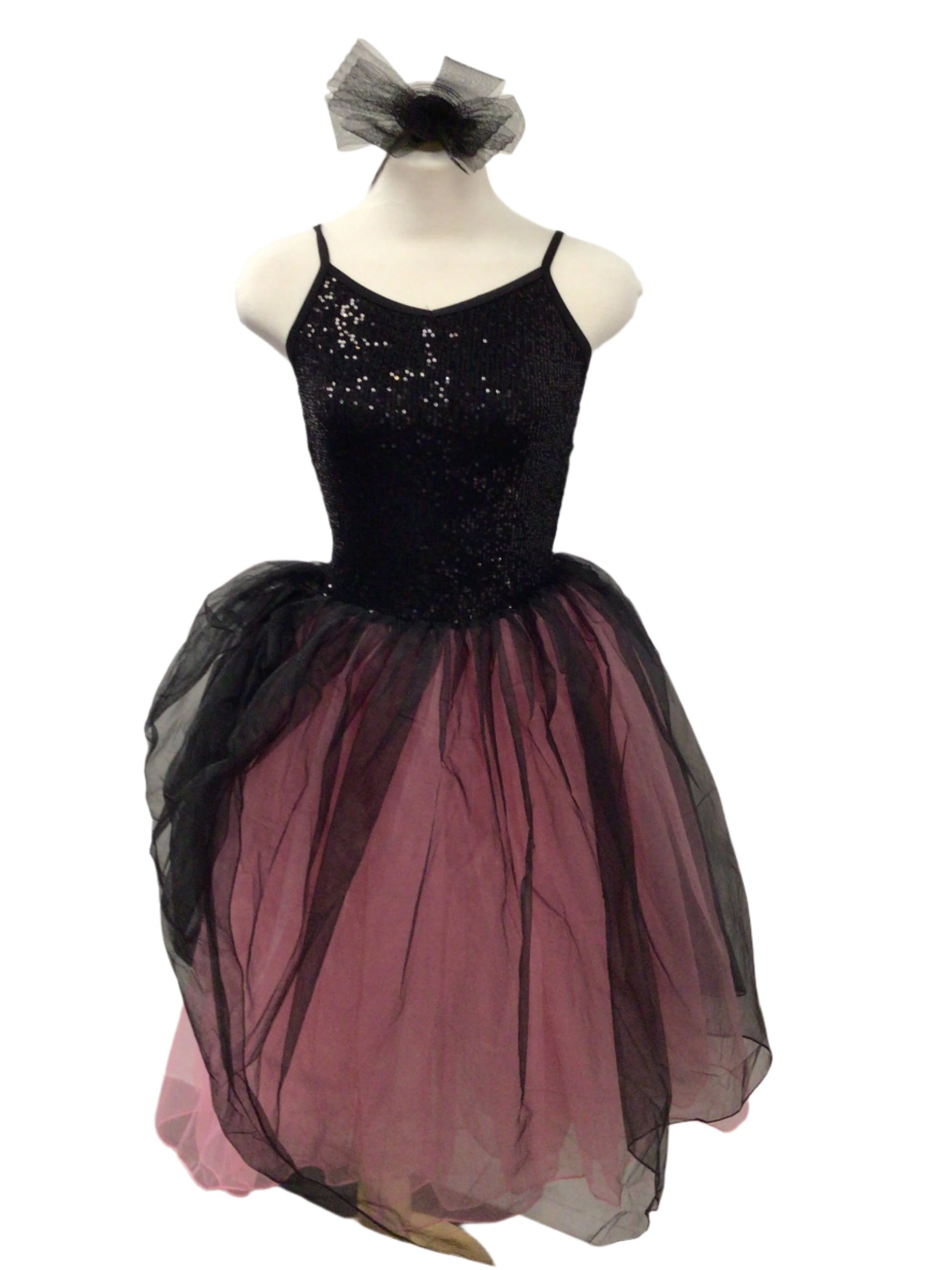 This elegant costume is perfect for any ballet piece. On a bodysuit base the bodice is black sequins with adjustable spaghetti straps with a four layer pink and black tulle romantic tutu that is rouched at the right hip. Comes in a small adult and is in perfect condition. Includes black tulle headpiece.
