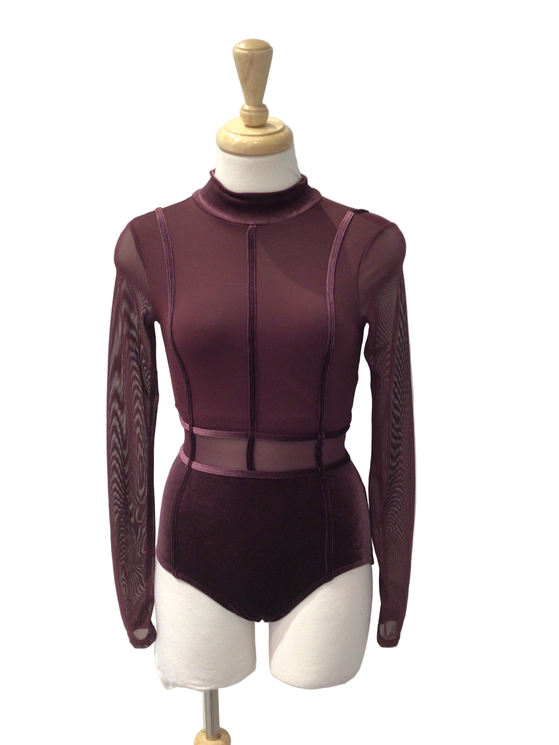 Perfect for acro or paired with a skirt or pants, this high neck and zippered back plum bodysuit has long mesh sleeves with a velvet collar and stripes down the front, cutouts at the waist and purple velvet bottoms. In an extra small adult, this costume is in perfect condition.