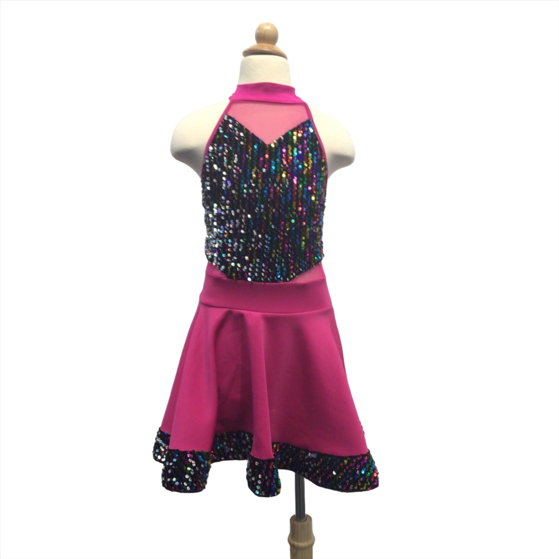 Stand out on stage in this joyful pink halter dress. Can be used for jazz, tap or theatre, this dress is on a bodysuit base with a halter top and fun cross straps on the back. The bodice is adorned with beautiful rainbow sparkles on a black base and tasteful mesh cutouts at the waist. The attached circle skirt is pink lycra and has trim with the same rainbow sequins material. In a medium child this costume is in excellent condition.