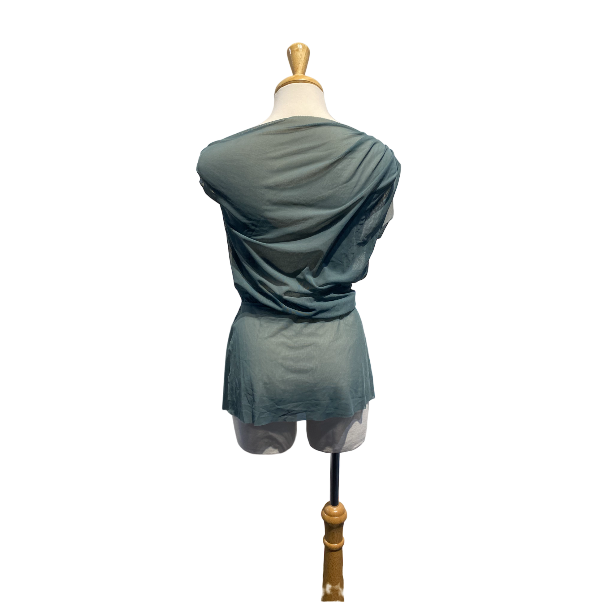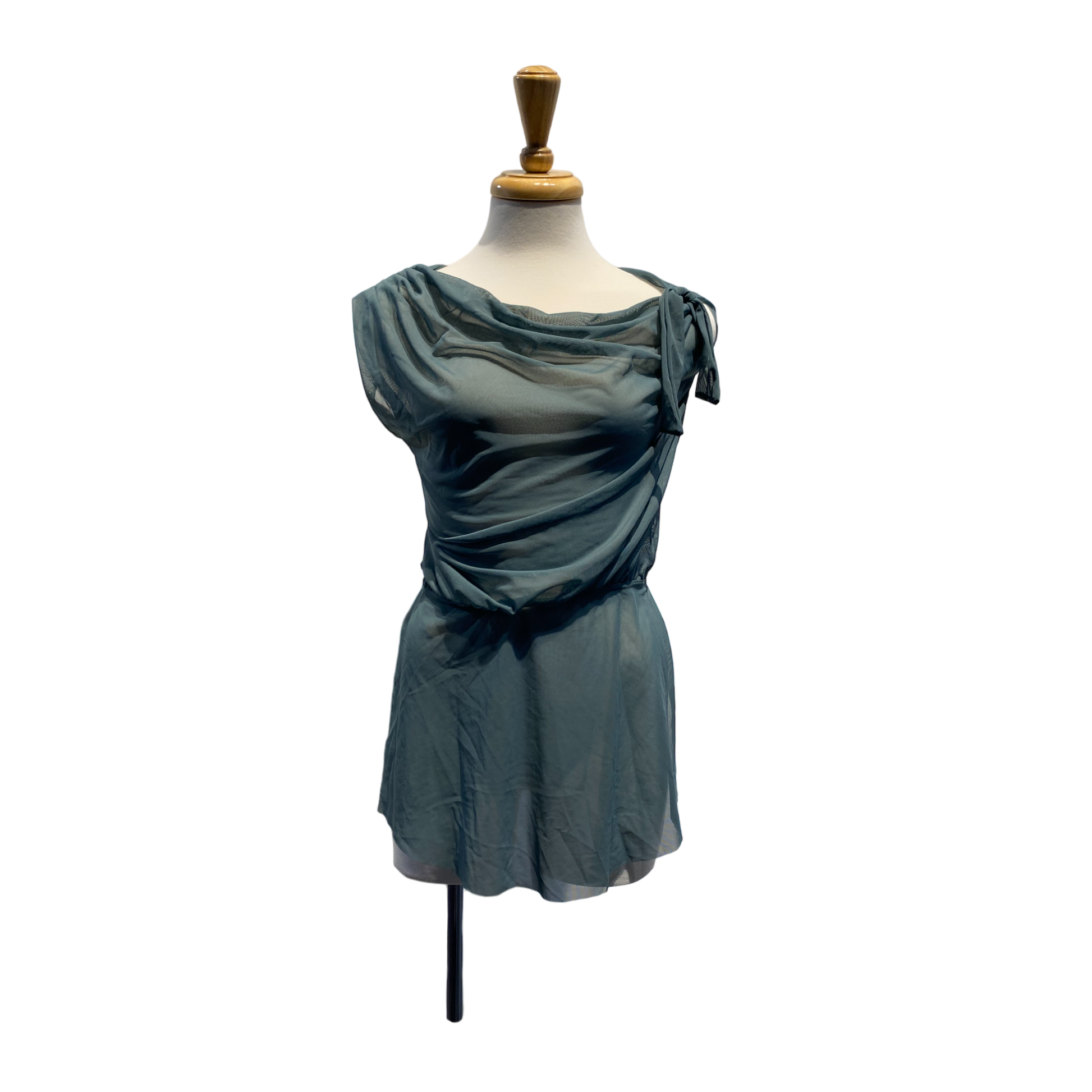 This sage over-layer is the most beautiful and movable piece which is stunning as a solo, or duet. While this piece will need something underneath as it is completely sheer, but the fabric falls in the most flattering pattern. The trendy sage colour pops on stage and looks lighter under stage lights. Size Adult Small.