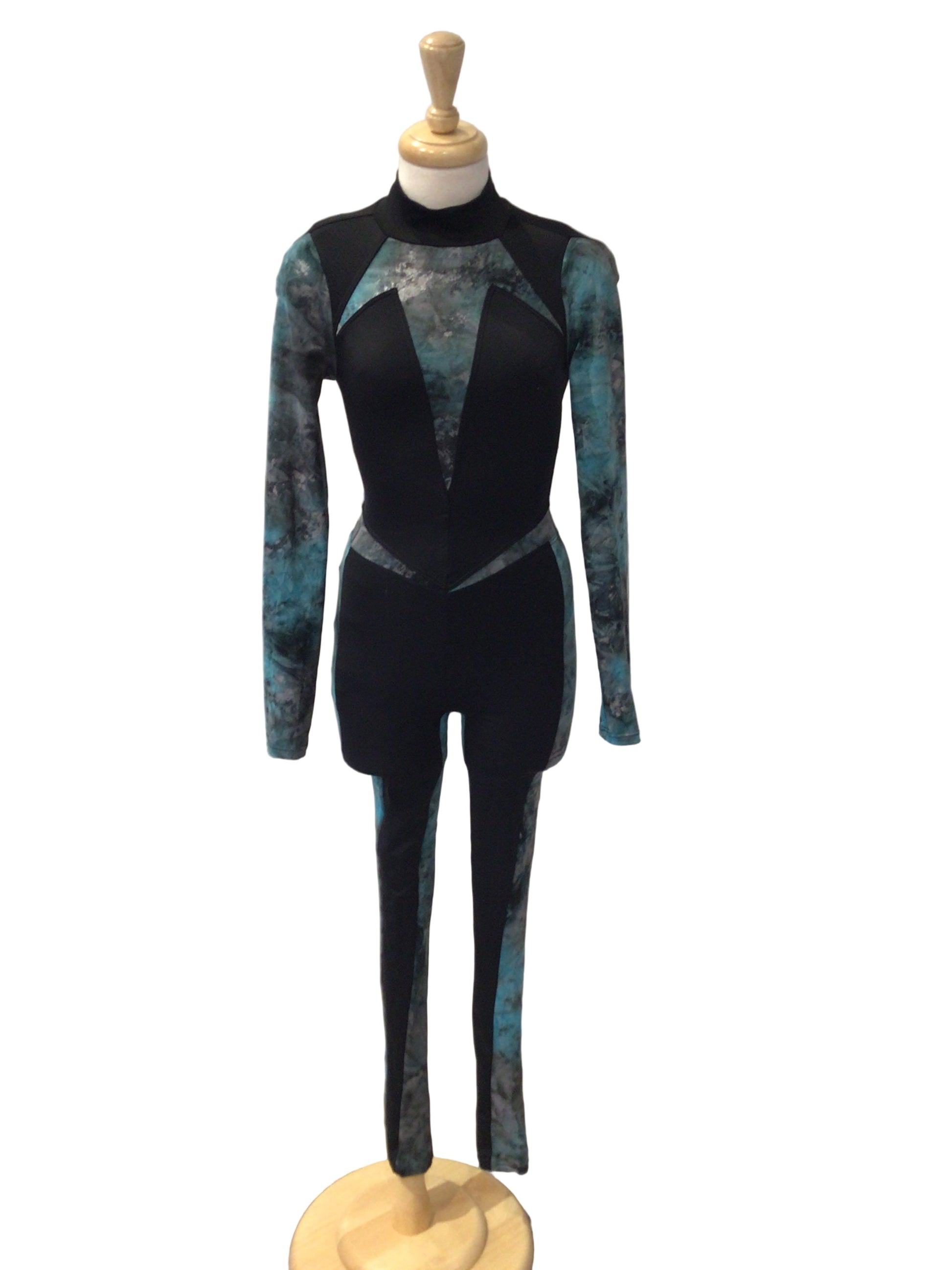 This long sleeve, high neck and open strappy back unitard has blue shiny cutouts and black lycra. In an extra small adult, this costume is in perfect condition.