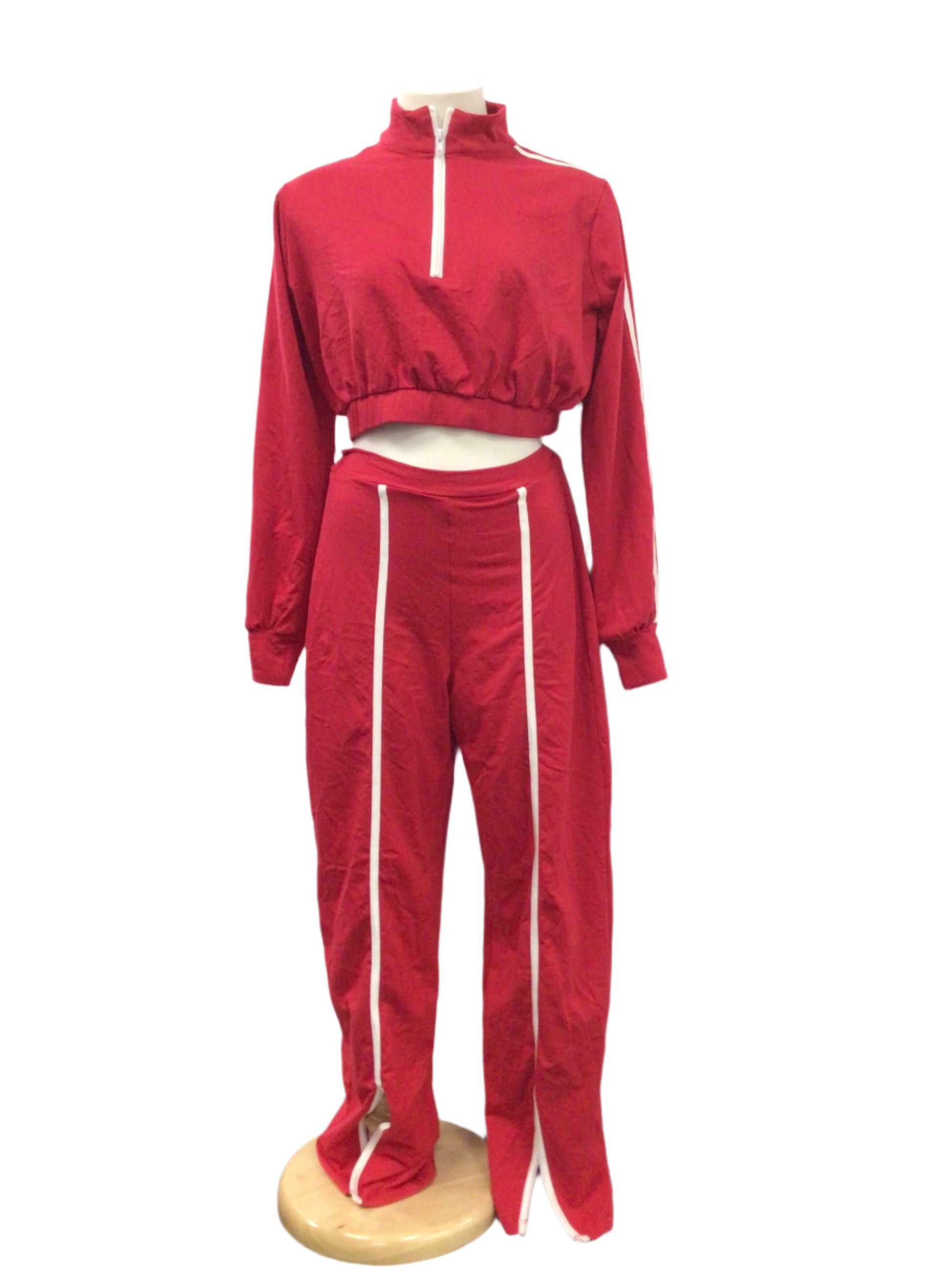 Perfect for hip hop , the crop top zip up, long sleeve, red jogging top has a white half zipper and two white stripes down the arms. The red jogging pants have the same white stripe on the front and back with an elastic waist band and slits in the front. In a large child,this costume is in perfect condition.