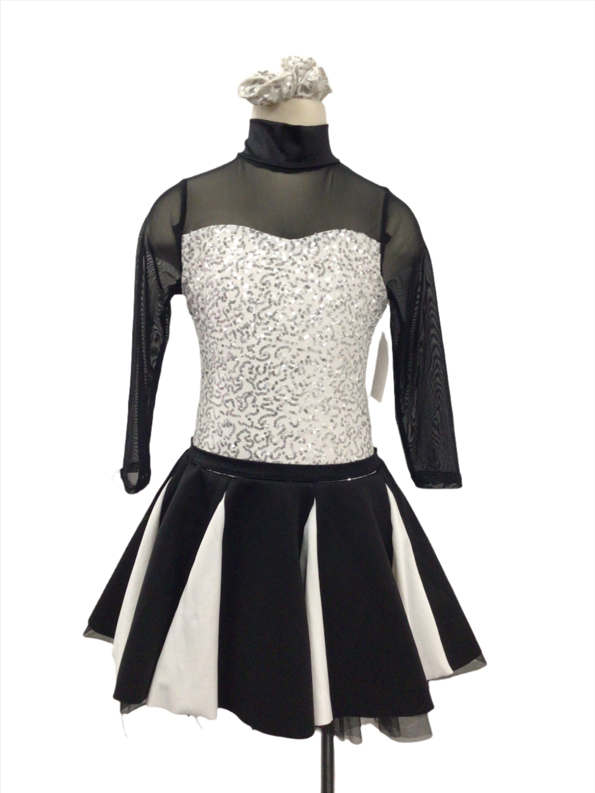 Be a standout on stage in this black and white jazz dress.On a bodysuit base, the top has a high neck with long sleeves of black mesh above a white sequin bodice and a tear drop open back. The attached pleated skirt alternates black and white lycra panelling with a layer of tulle for that extra poof. In a large child, this costume is in perfect condition. Includes white sparkly scrunchie.