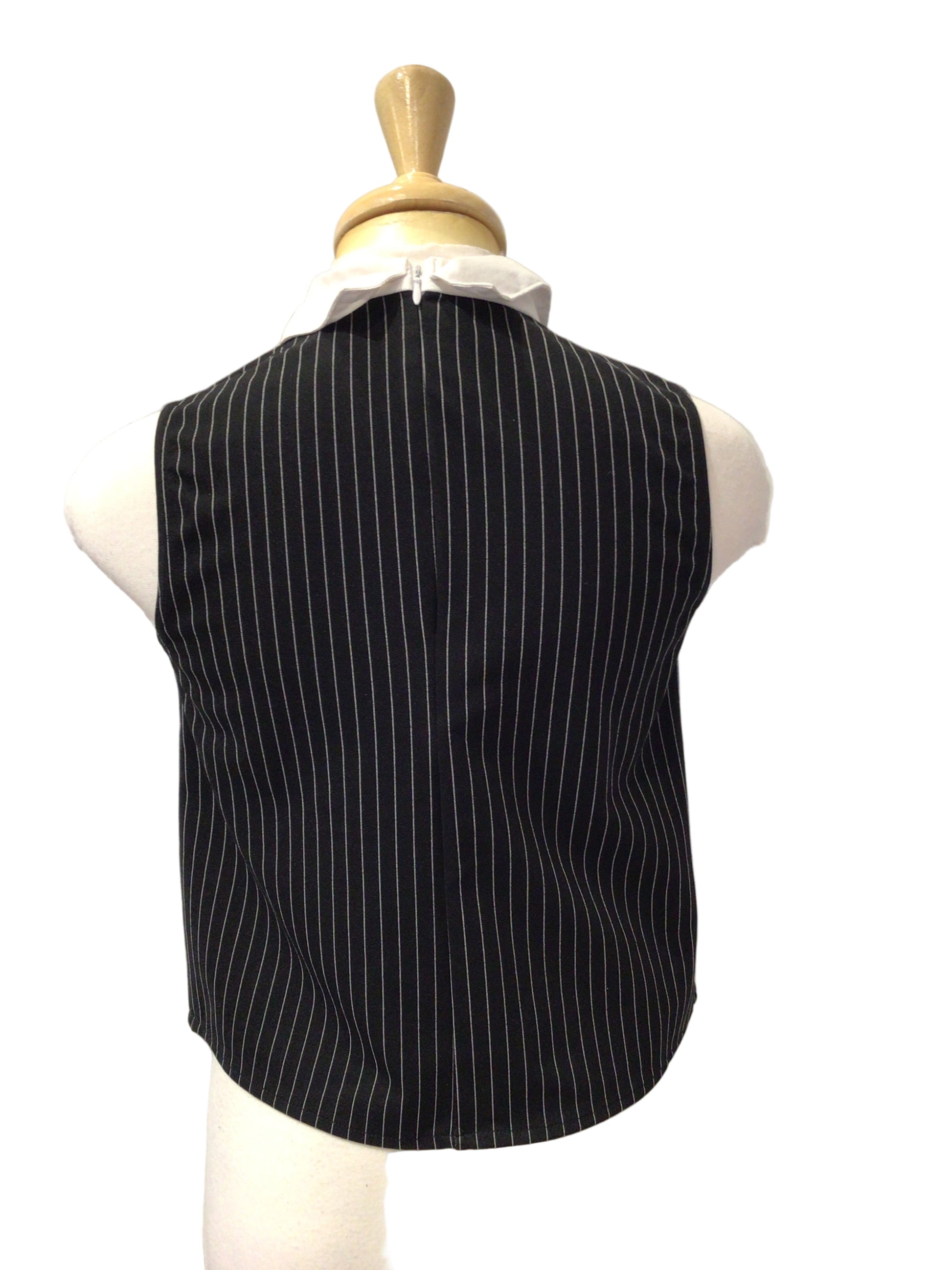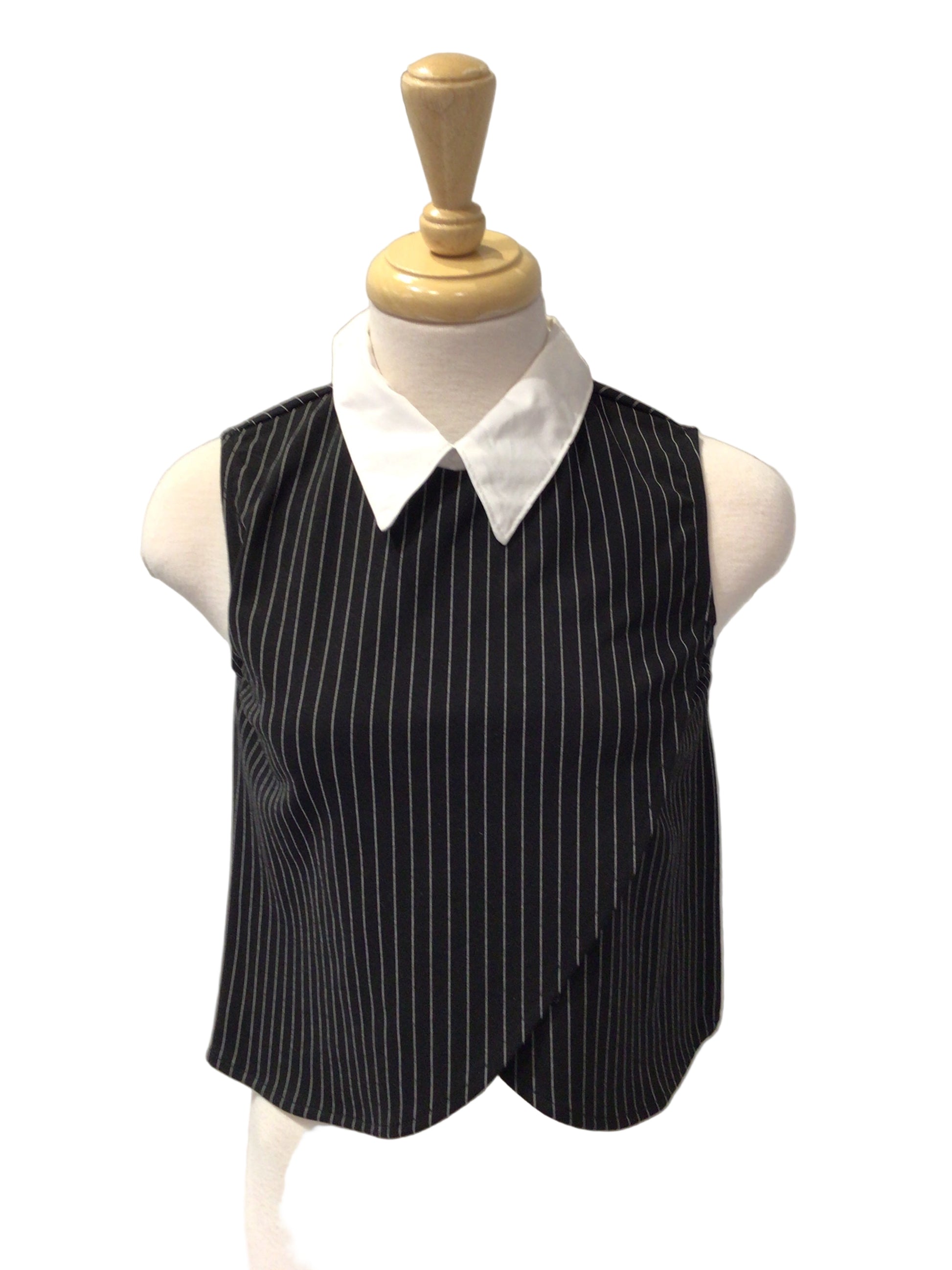 This top can be worn with leggings, pants or shorts. Black and white pinstripes with a white collar, zipper back and cross over front in a small adult size.