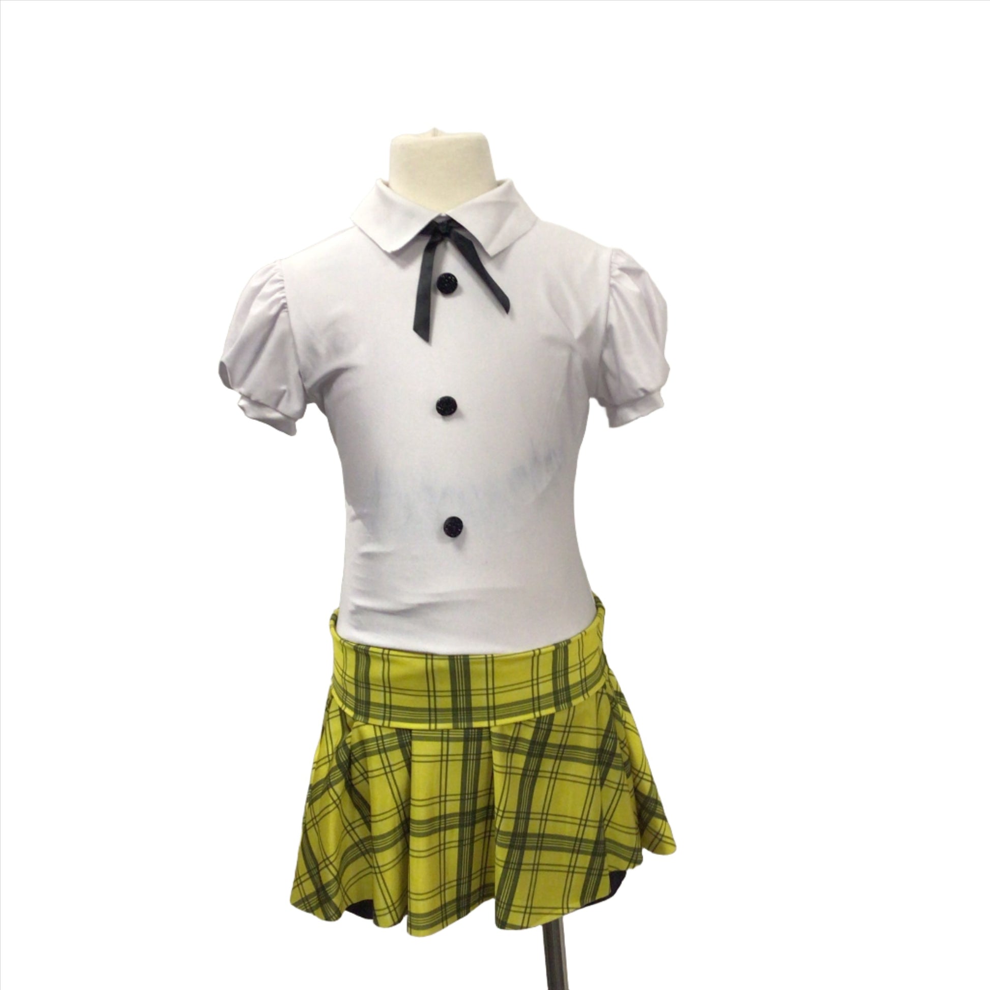 Perfect for any dance style or theatre production, this biketard has a white lycra top with short poof sleeves, a collar, and black tie and button detail and black shorts. The attached full circle short lycra skirt is of yellow and black plaid. Comes in an extra large child and is in almost perfect condition. Includes black suspenders , white and plaid booties and yellow hair ribbon
