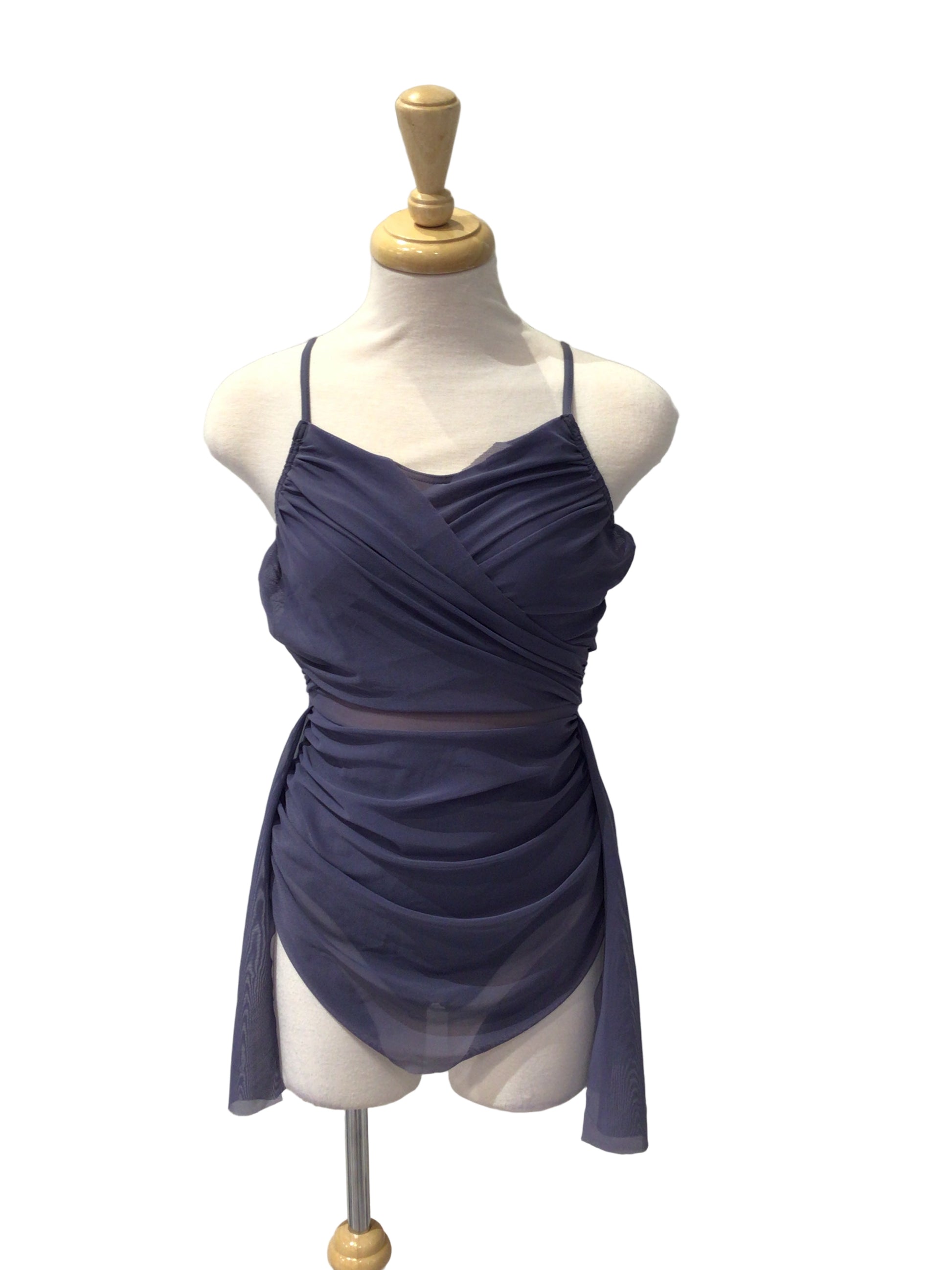 This costume is perfect for ballet or lyrical. On a spaghetti strap blue grey bodysuit, the attached half skirt of power mesh has a drapy front with rouching on the side of the bodice. In a small adult size, this costume is in perfect condition.