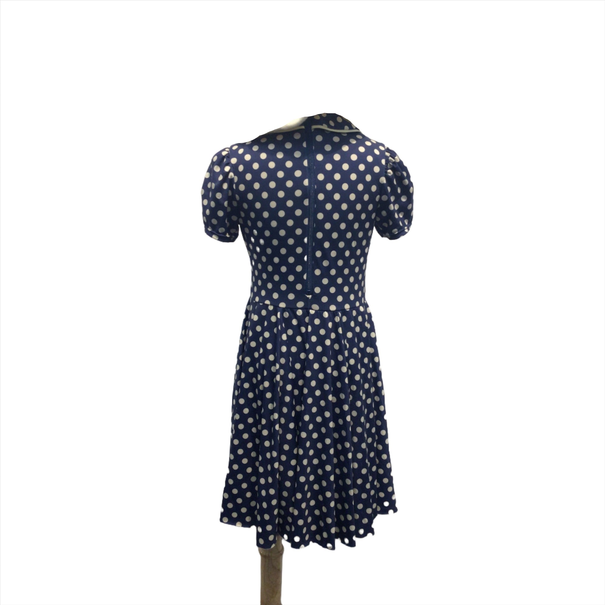 Ooh la la, this 1940's french inspired dress is great for any dance style of theatre production. On a bodysuit base, the navy and white polka dot dress has a collar and cap sleeves and a zippered back. This costume comes in a small child and is in perfect condition.