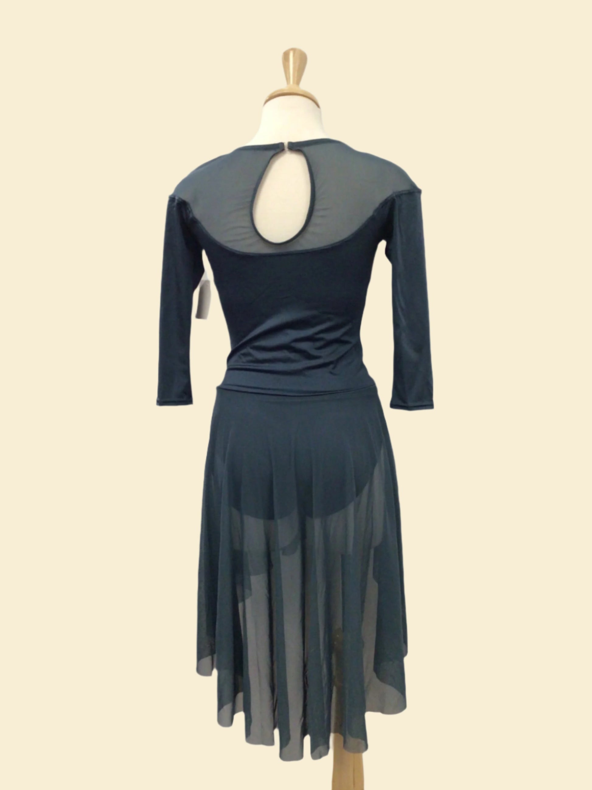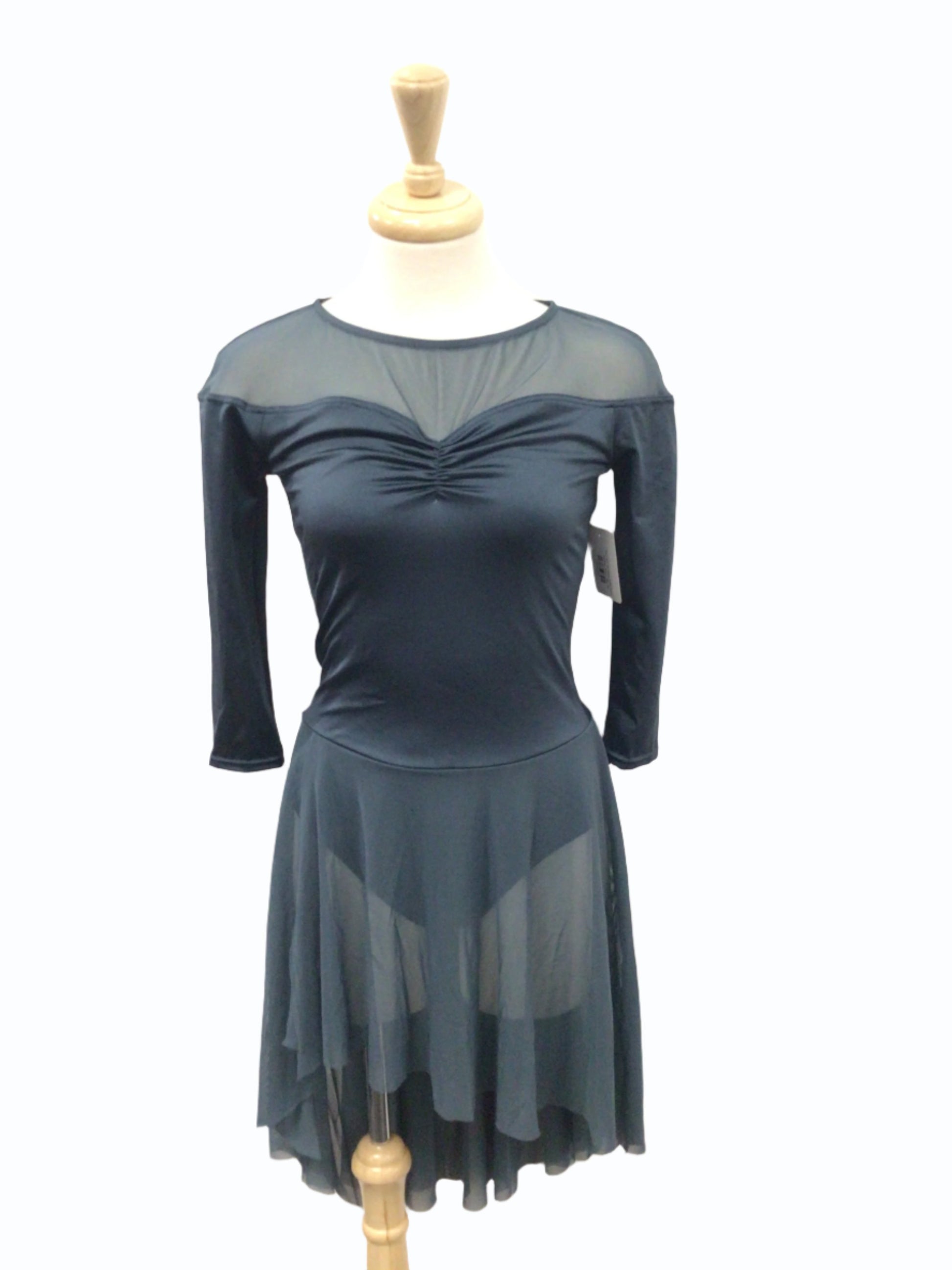 This tastefully understated dark teal dress is perfect for ballet or lyrical. On a bodysuit base, the pinched front neckline has mesh shoulders and 3/4 length sleeves with an oval cutout back. The attached power mesh skirt is high in the front and lower in the back. Includes a teal flower applique hairpiece and comes in a medium adult size.