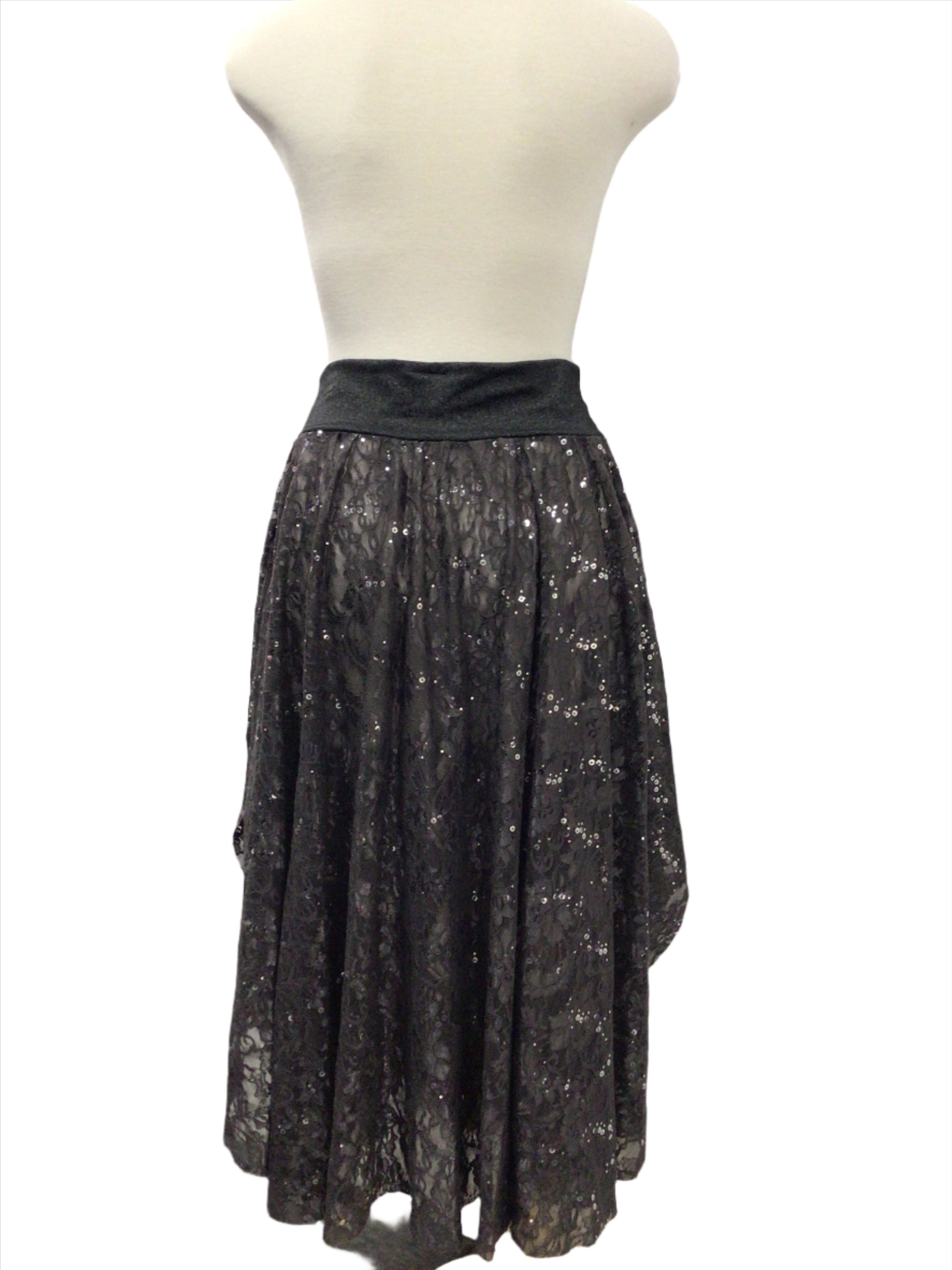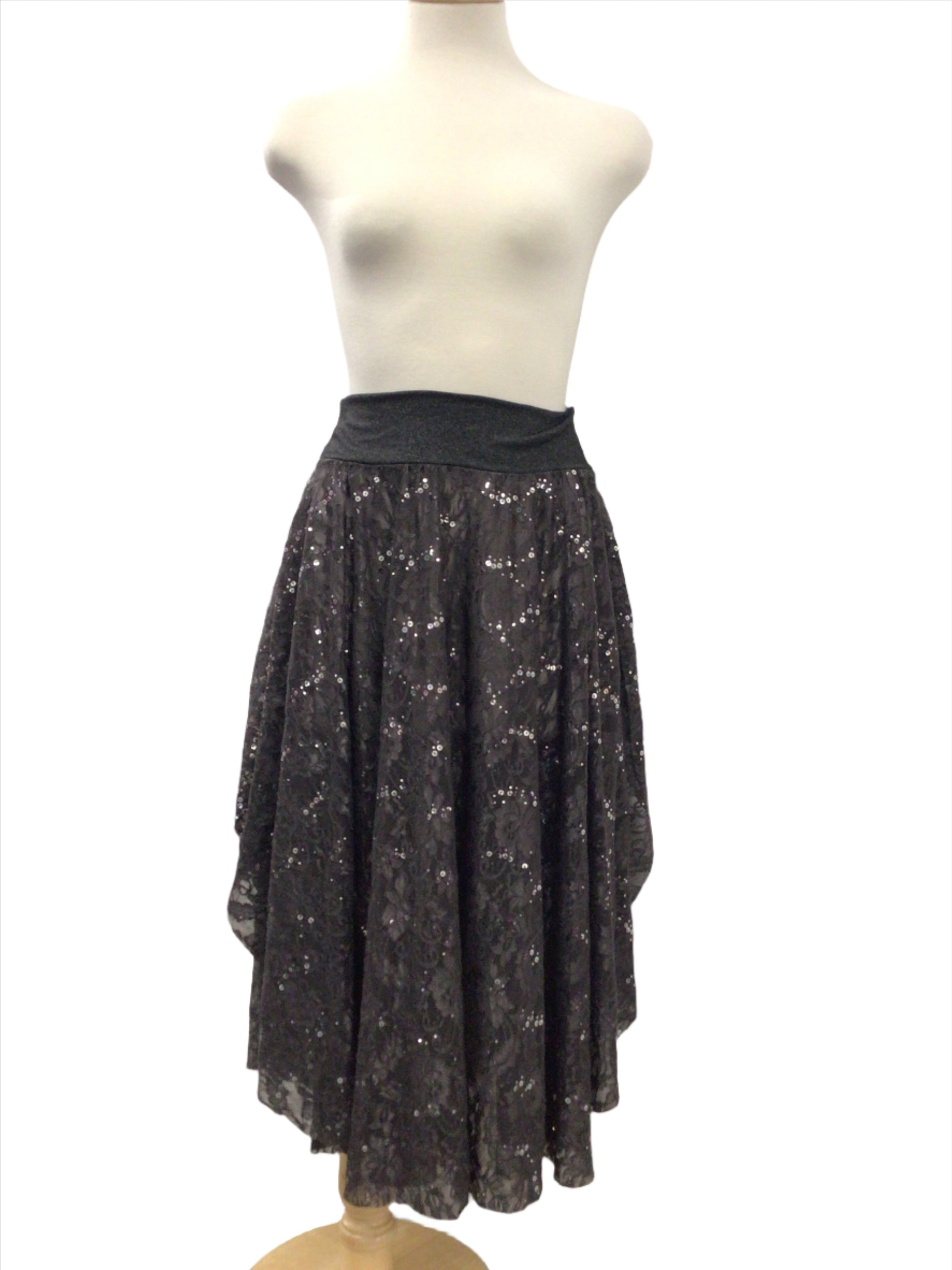 Great for any dance style this grey skirt can be paired with a top or bodysuit. An elastic waistline the two panel skirt is made from stunning sequined grey lace and hangs to the ankles with slits up both sides. Comes in a small adult size and is in perfect condition.