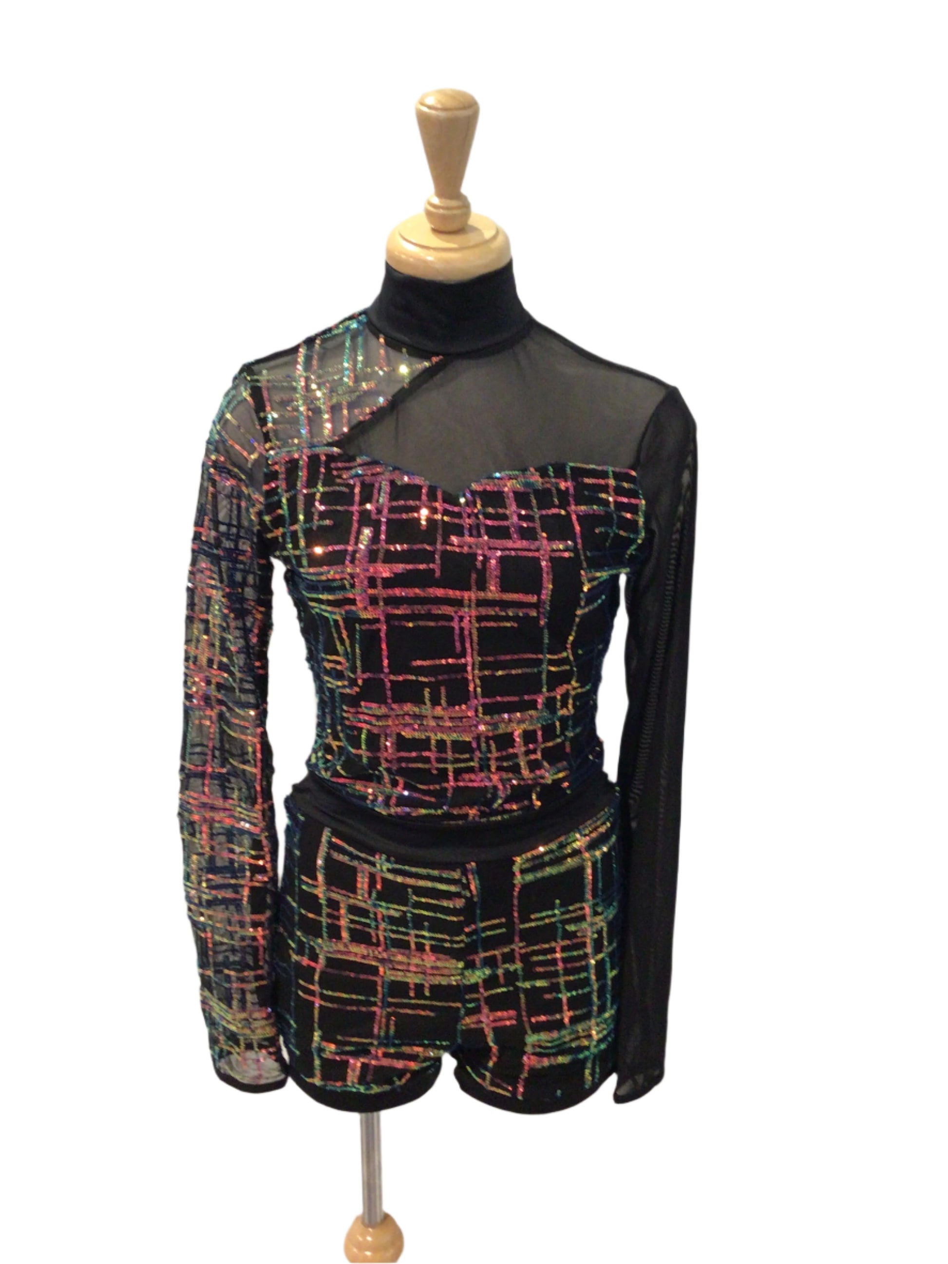 Stand out on stage in this abstract costume perfect for modern, jazz or tap. A black long mesh sleeve biketard with a high neck and back with a unique iridescent sequin pattern. In an extra small adult size, this costume is in perfect condition.