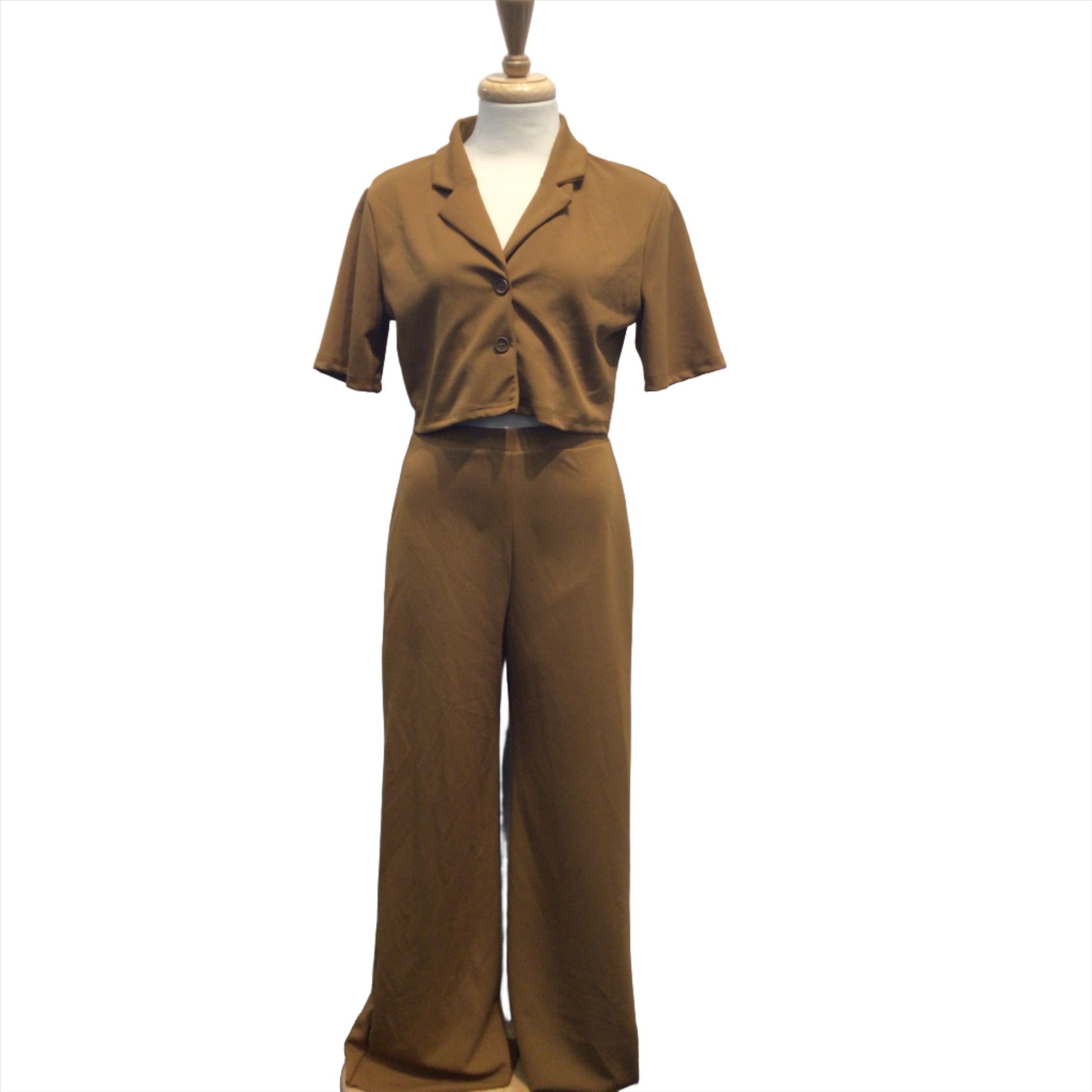 Be unique in this one of a kind amber coloured two piece contemporary or modern costume. The crop top is short sleeved with a collar and buttons down the front. The matching pants are wide legged and have an elastic waist band. Comes in small adult and is in perfect condition.