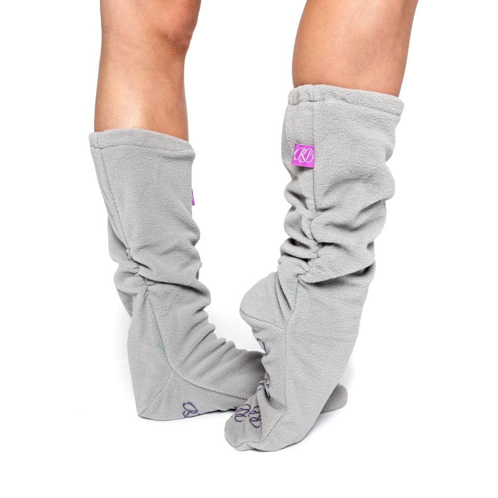 Get cozy in super-soft RP Fleece Warmup Booties with ruched sides and RP-themed traction patches. Wear them over tights, bare feet, ballet slippers or pointe shoes to keep your feet and ankles warm before class or backstage. The double-sided fleece is as soft inside as out, with sock-like conformity to the foot and a moderate weight, for warmth without overheating. Gentle elastic holds the booties at mid-calf without binding. Ladies’ street-shoe sizing (choose a slightly looser fit for use over pointe shoes).