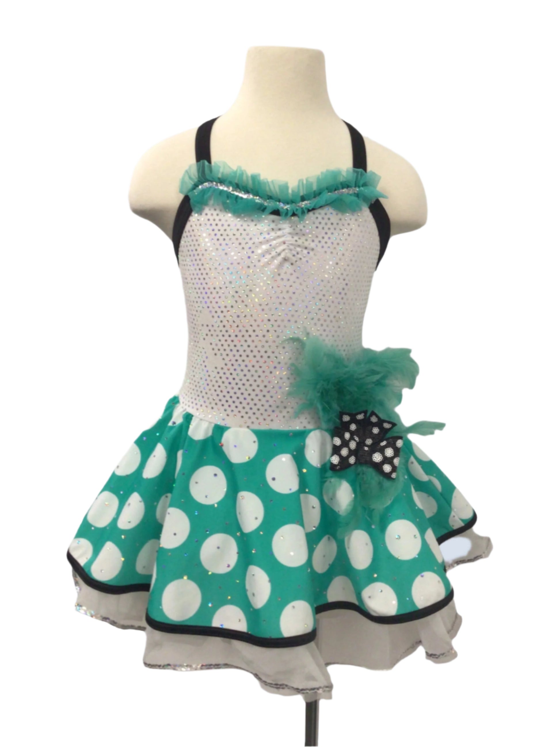 With a little pizzazz , this costume is sure to stand out on stage. On a bodysuit base, the thin black strap top that crosses in the back, has a white sequins bodice and a teal green ruffle on the pinched front neckline. The attached three layer tutu has two white tulle layers with silver sequin trim and a top overlay of teal with white polka dots. With a feather accent with a black and white bow tie on the right hip , this costume comes in a intermediate child and is in perfect condition.