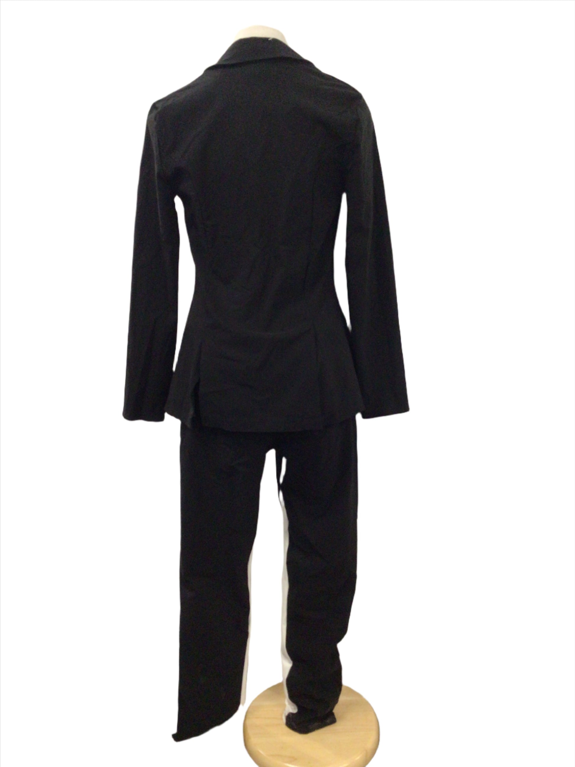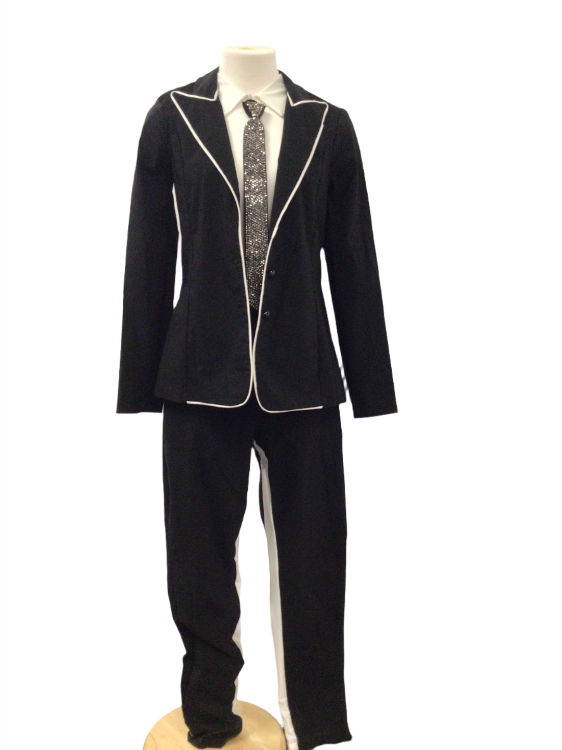 This costume is perfect for jazz, tap, modern or theatre production. In stretchy fabric, this one piece has a white sleeveless top with collar attached to stretchy black pants with a white stripe down the inseam. The black suit jacket is also stretchy and has buttons with a white trim. This costume comes in a small adult and is in perfect condition. Includes black diamond tie and white sparkly anklets.