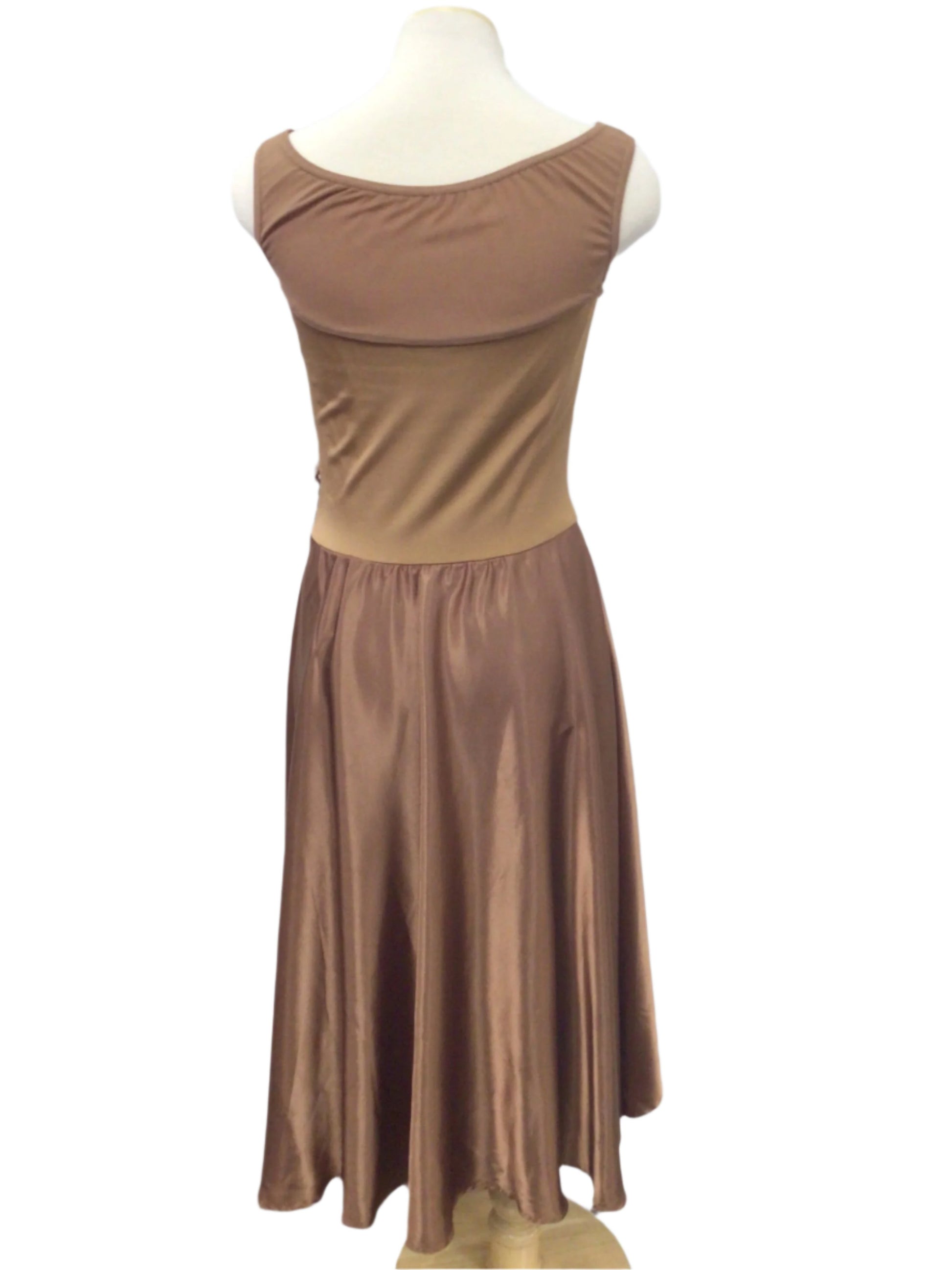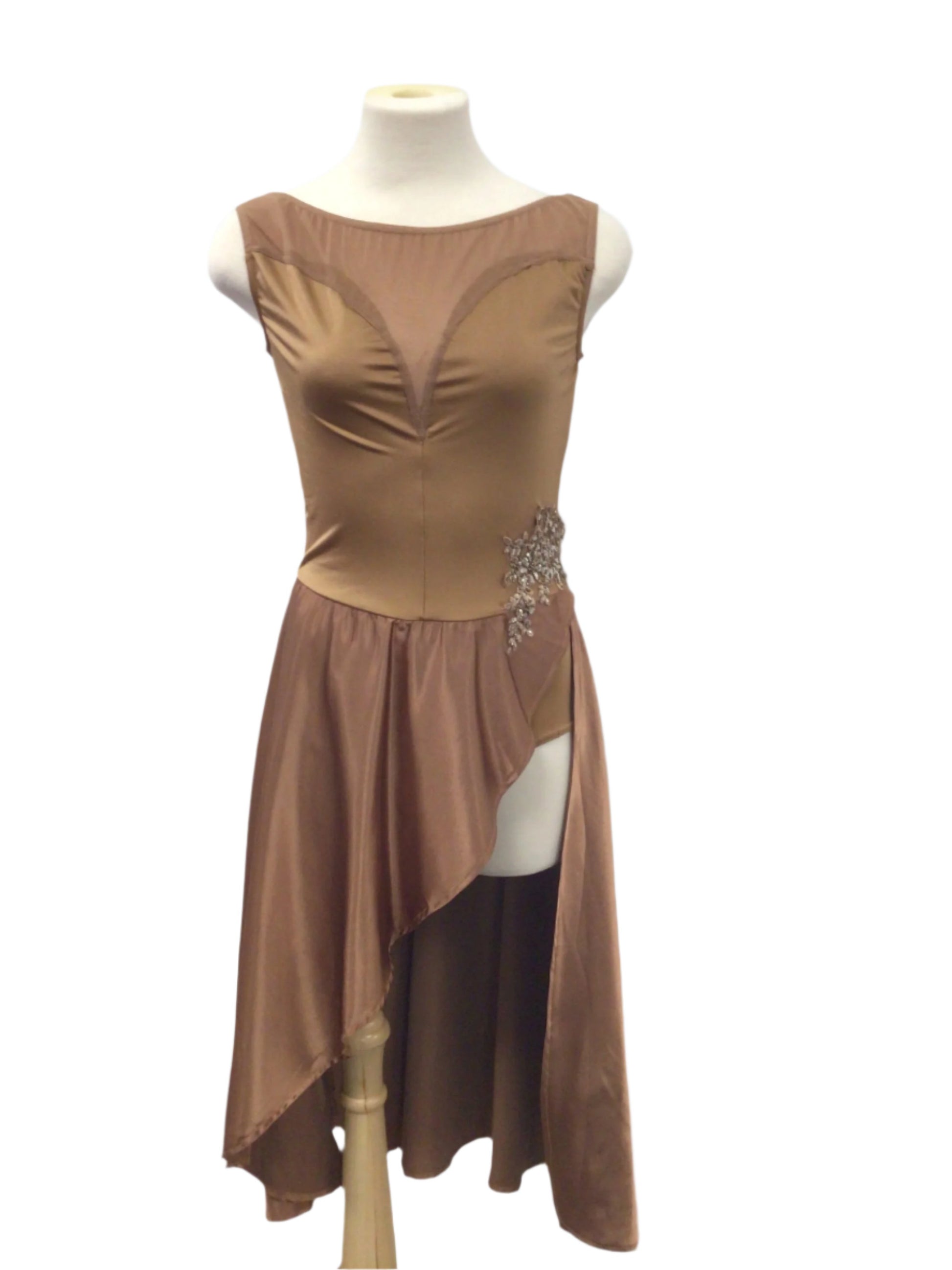 This costume is perfect for any ballet or lyrical number. Brown satin high low skirt that opens at the left hip is attached to a bodysuit base with a high neck line that has a mesh V down the front and a tasteful applique at the hip. Comes in a medium adult, this costume is in perfect condition.