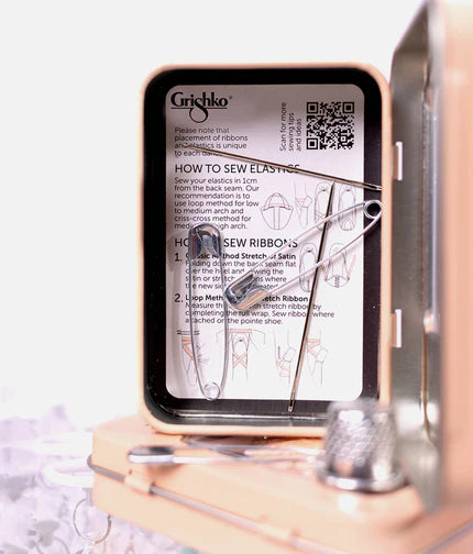 All in one sewing kit for dancers that is ideal for sewing a pair of pointe shoes or preparing for an expected emergency. The kit includes: