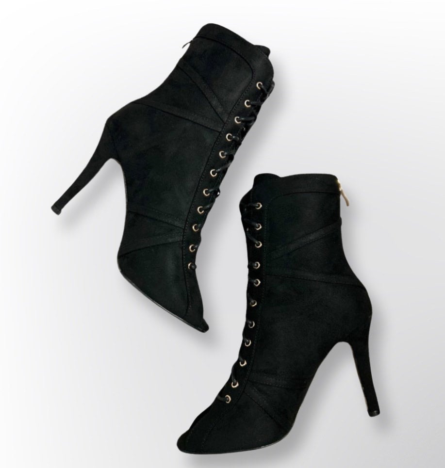 An elegant suede ankle high bootie perfect for the dance floor. The Stella features a suede vegan leather, metal eyelet lace up, open toe front, tongue cover front, stiletto heel, and a back zipper closeure.