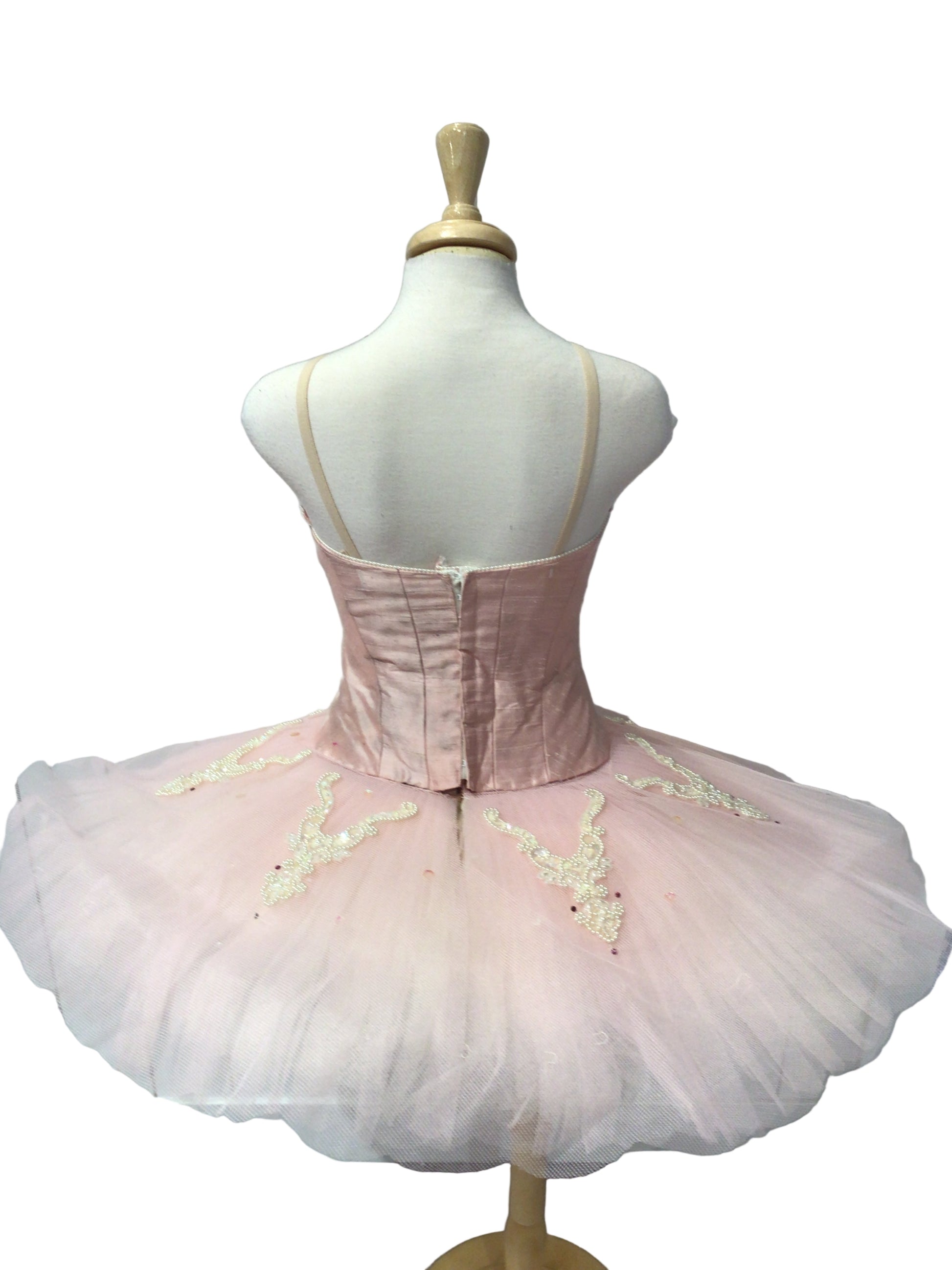 This stunning tutu has a light pink bodice with boning, skin tone spaghetti straps and a delicate pearl and rhinestone applique down the front, with hook and eye fastener in the back. The attached pink tulle platter has a 14 inch top layer, mesh brief and the same pearl and rhinestone appliques, in a small adult size.