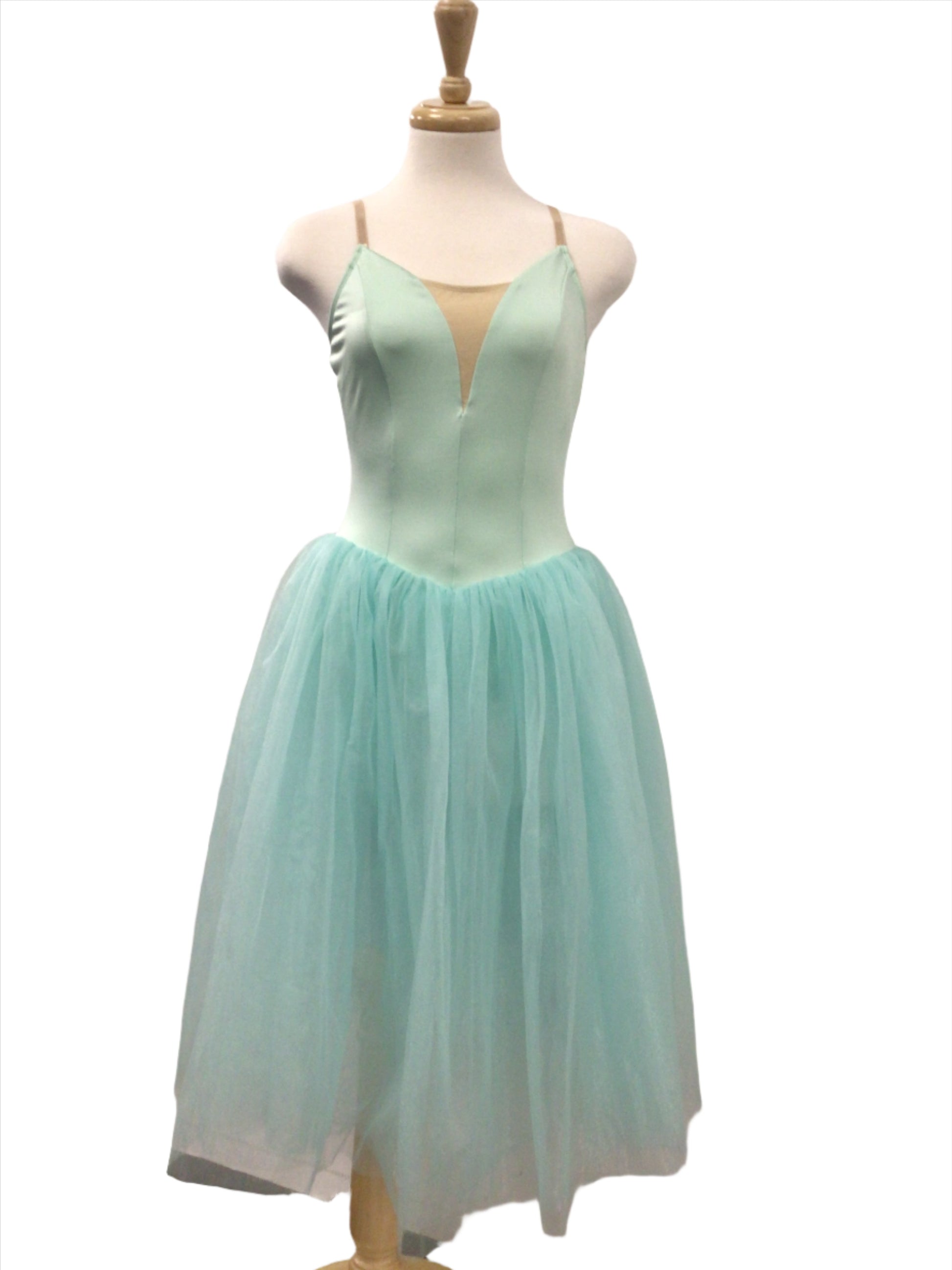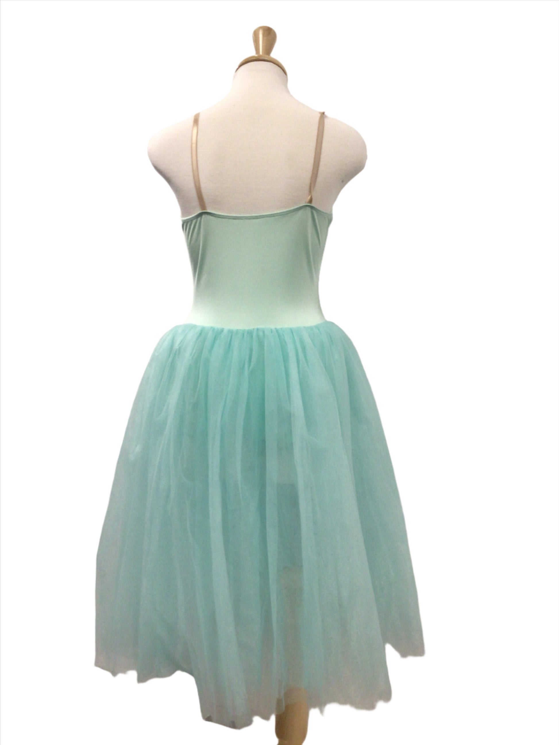 This versatile costume can be used for any ballet piece. A light blue teal romantic tutu on a bodysuit base, the top has skin tone speghetti straps, with a V down the front that is also skin tone and princess lines on the bodice. The attached romantic tutu is 4 layers of teal tulle and includes a matching tulle arm bands. Comes in an adult large and is in perfect condition.