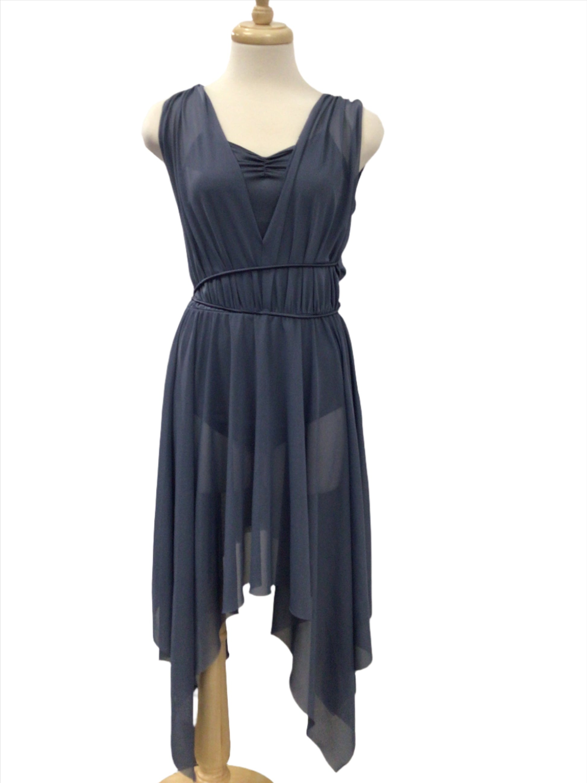 Dance with elegance, in this Grecian inspired navy blue lyrical dress. On a speghetti strap bodysuit base, the navy mesh over dress, drapes over the shoulders making a V front and back, with a strappy rope like belt , and a long skirt that hangs longer on both sides. Comes in a medium adult and is in perfect condition.