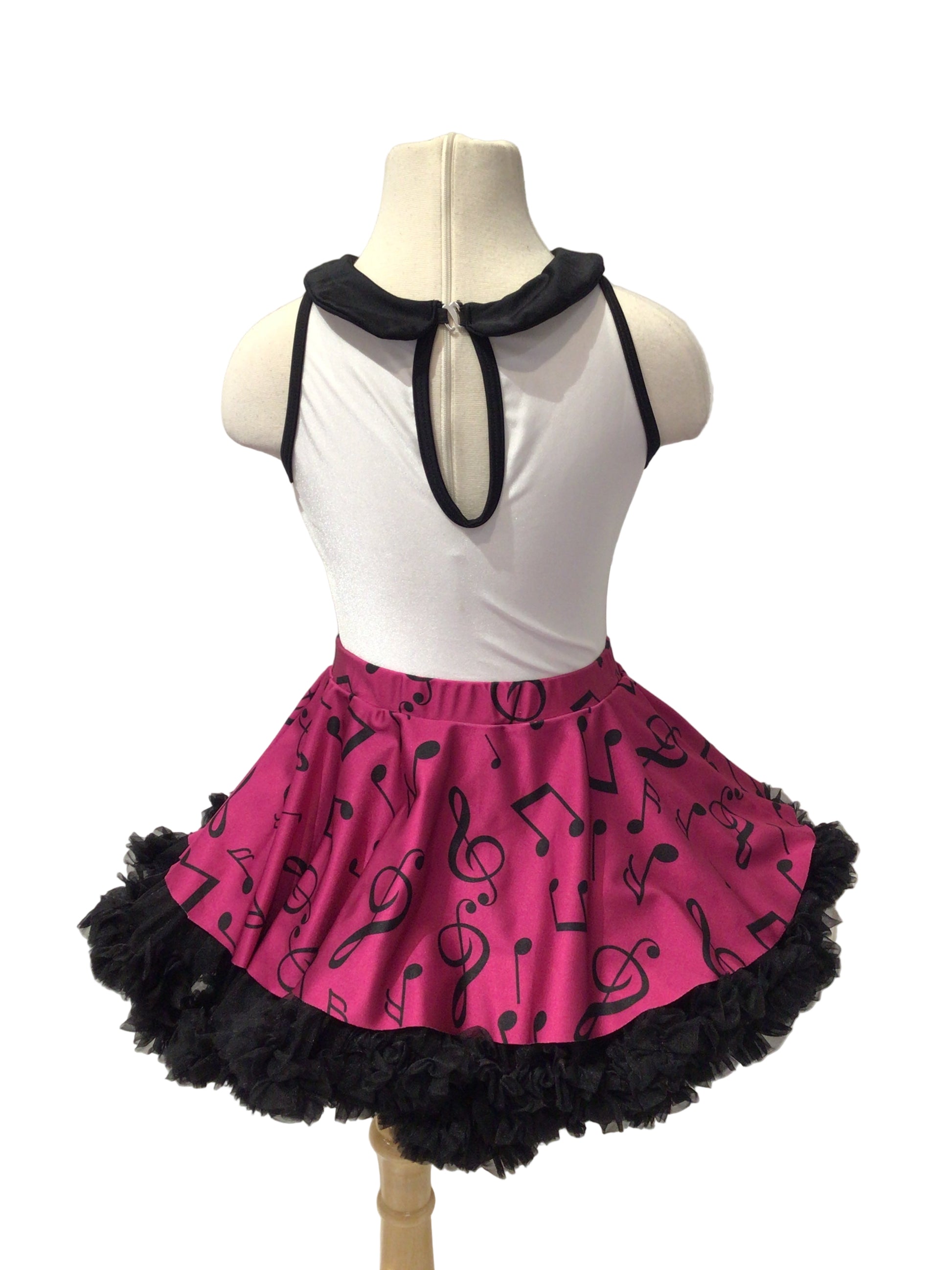 This costume includes a white tank style bodysuite, with a high neck and black collar, with black rhinestoned music notes on the front, a black crinaline and pink lycra over skirt with black music notes. In a child extra large. Includes red bow hairpiece.
