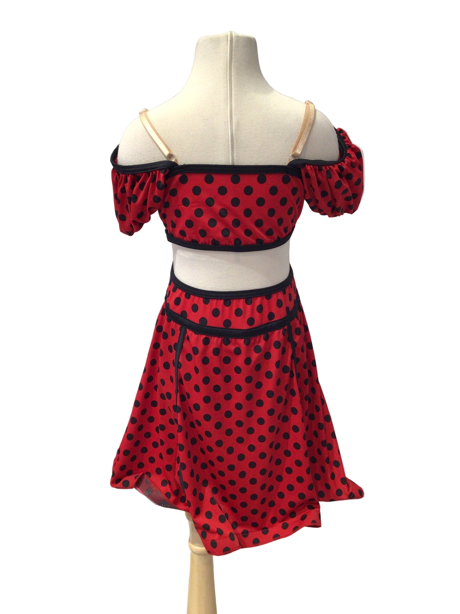 This red and black polka dot dress has short puffy sleeves, a mid length circle skirt on a brief and an open back in a large child size.