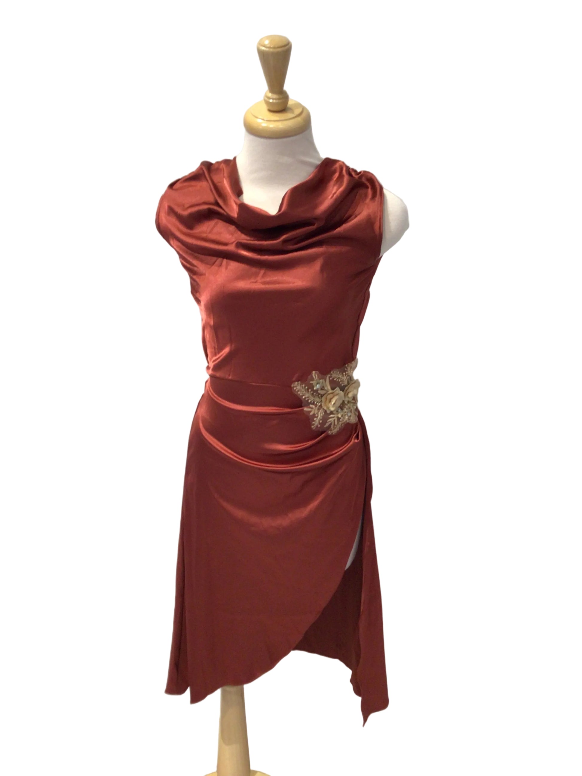 On a bodysuit base, this rust coloured satin dress has a drapey top with a mid length skirt that has a slit on one side and a gold flower applique on the right hip. In a extra small adult.